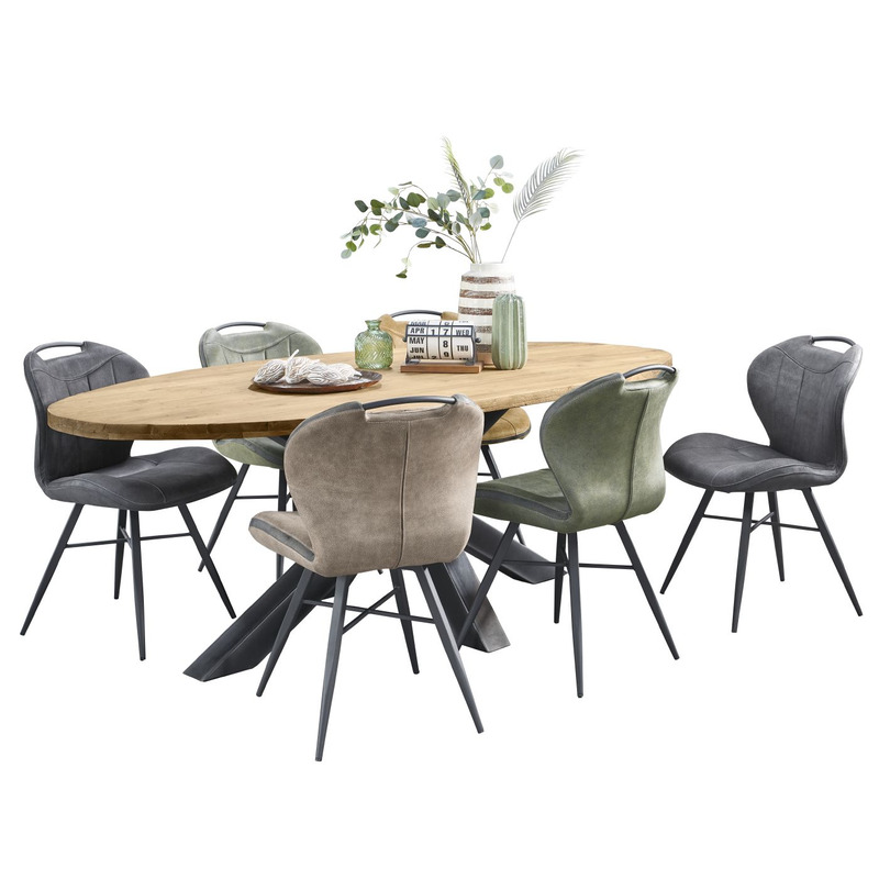 Deze stoere eetstoel is verkrijgbaar in de stof Luxor in de kleuren cognac, antraciet, moss en liver.
