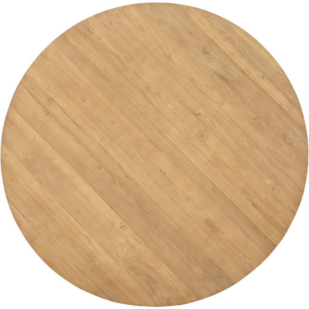 Ontdek de perfecte harmonie van elegantie en duurzaamheid met onze ronde eettafel Aska. Het tafelblad, vervaardigd uit 3 cm dik recycled teak, straalt karakter en warmte uit. De met zorg afgeschuinde rand voegt een subtiel vleugje verfijning toe aan deze tijdloze creatie. De tafel staat op een moderne, metalen spinpoot die niet alleen voor stabiliteit zorgt, maar ook een eigentijdse touch aan je eetruimte geeft.