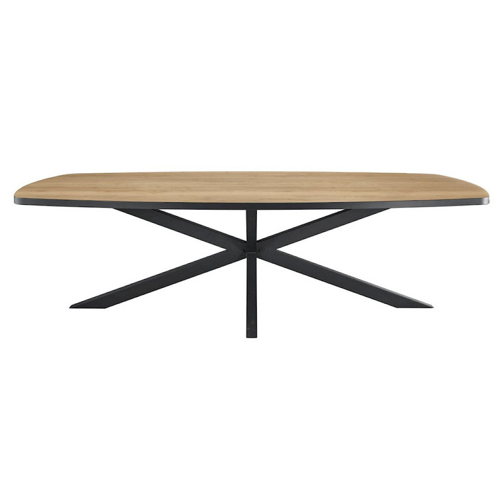 Deze Deens ovale eettafel Camerino is voorzien van een zwart metalen spinpoot en heeft een blad van lamulux in de kleur natur decor met een zwarte bladrand. Lamulux is kras- en stootvast, kleurecht, hygiënisch, uitstraling van echt hout. Het Deens ovale blad wordt ook wel tonvormig genoemd, het zit tussen rechthoekig en ovaal in. Het biedt de ruimte van een rechthoekig blad, met een elegante uitstraling. De tafel wordt ongemonteerd geleverd, uiteraard met een duidelijk montagehandleiding.