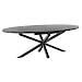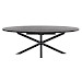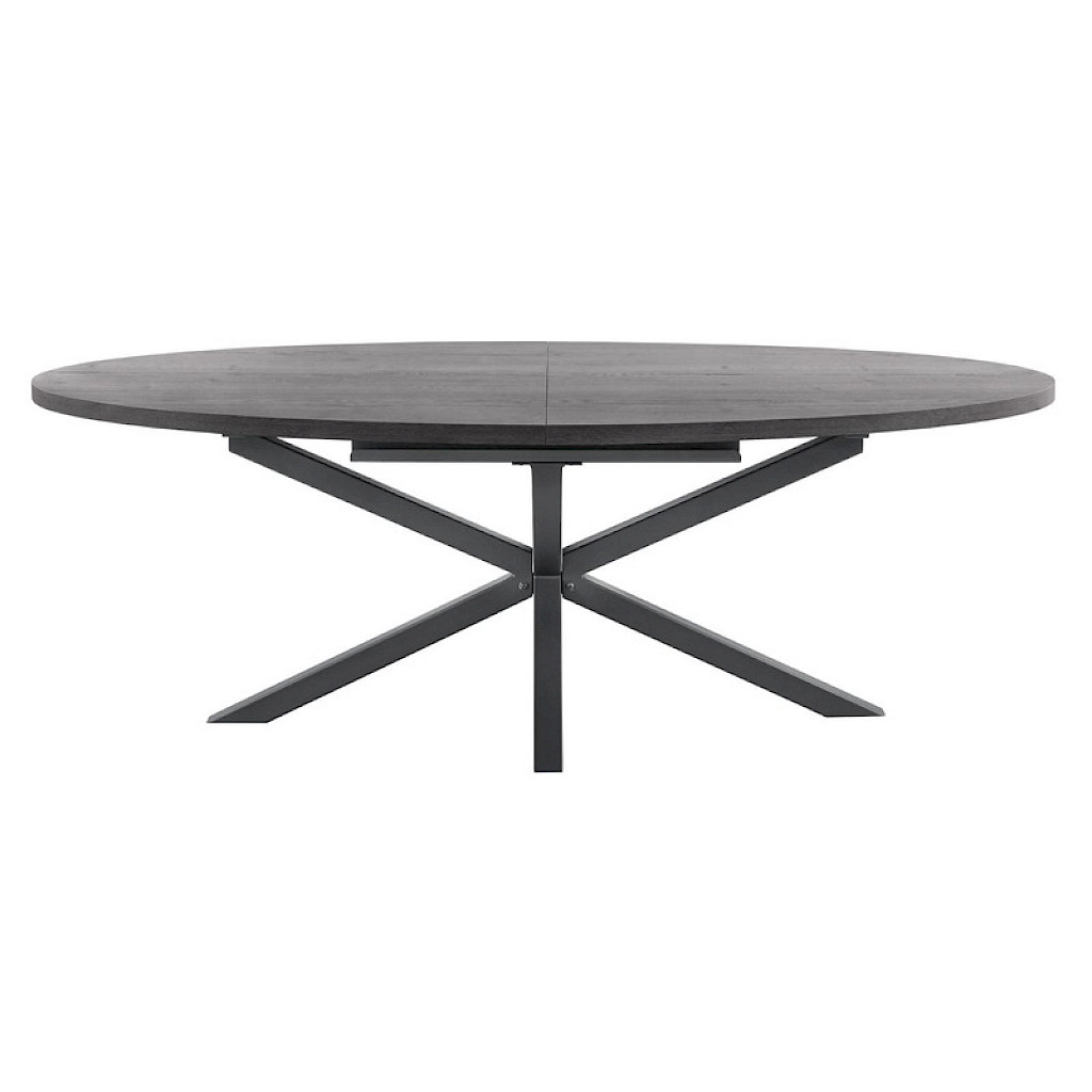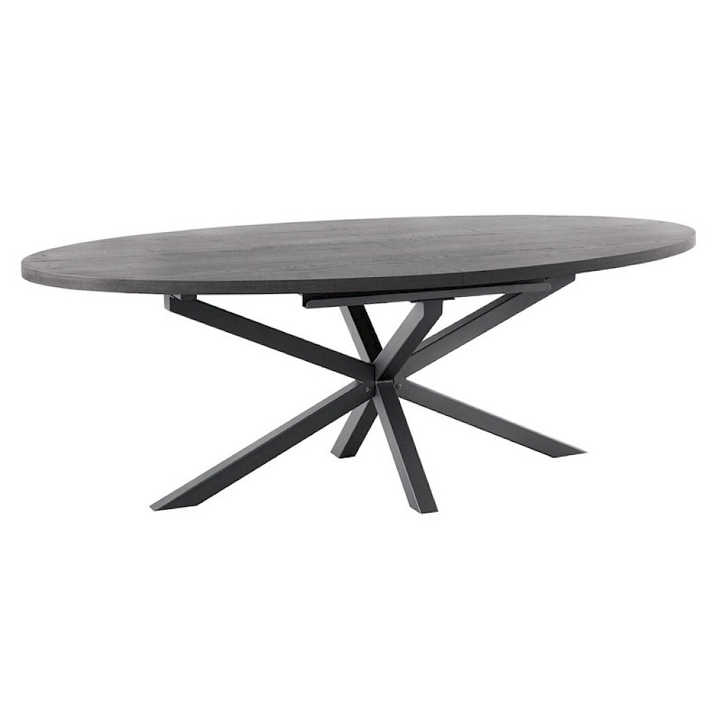 Deze eettafel heeft een ovaal blad in kleur noir decor en een zwarte metalen spinpoot. De tafel is 102 cm breed en heeft een lengte van 201,5-258 cm, waardoor je in totaal zeker 6 tot 8 stoelen aan deze tafel kwijt kunt. De hoogte tot de onderkant van de tafel is ca. 72,4 cm; dit is belangrijk als je er armstoelen aan wilt zetten. De eettafel is uitstekend te combineren met de andere meubelen uit de Formia serie.