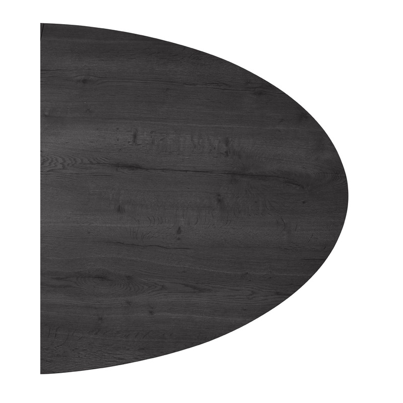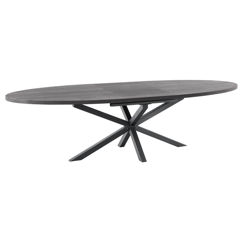 Deze eettafel heeft een ovaal blad in kleur noir decor en een zwarte metalen spinpoot. De tafel is 120 cm breed en heeft een lengte van 221,5-278 cm, waardoor je in totaal zeker 6 tot 10 stoelen aan deze tafel kwijt kunt. De hoogte tot de onderkant van de tafel is ca. 72,4 cm; dit is belangrijk als je er armstoelen aan wilt zetten. De eettafel is uitstekend te combineren met de andere meubelen uit de Formia serie.