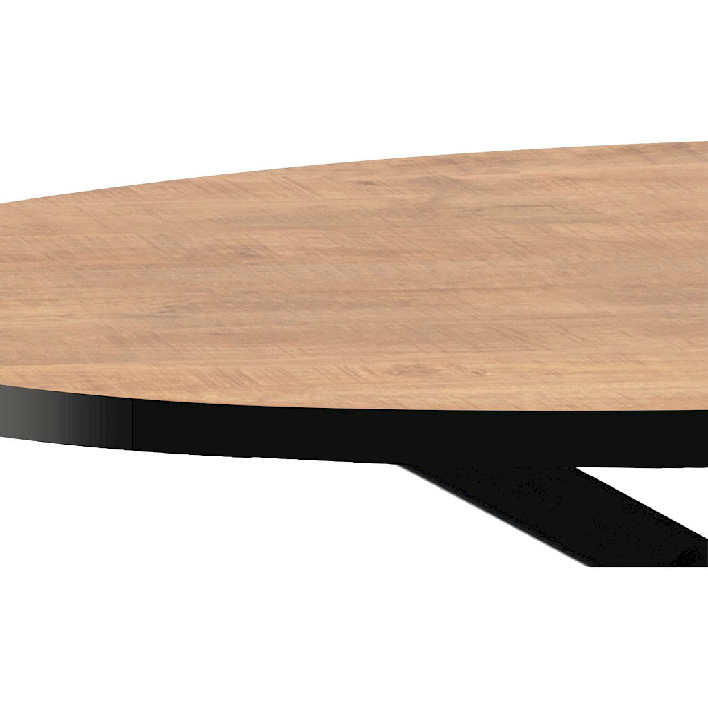 Deze eettafel is 250 cm lang, 128 cm breed en 77 cm hoog. Het blad, uitgevoerd in een warme mango kleur en afgewerkt met een zwarte rand, vormt een krachtig contrast met het zwarte metalen spinonderstel. Deze combinatie geeft de tafel een moderne en robuuste uitstraling. De ovale vorm zorgt voor een speels en uitnodigend effect, terwijl de stevige spinpoot voldoende beenruimte biedt. De tafel biedt comfortabel plaats aan 6 tot 8 personen. De hoogte van de onderregel is ca. 73 cm, wat voldoende ruimte geeft voor de meeste eetkamerstoelen.