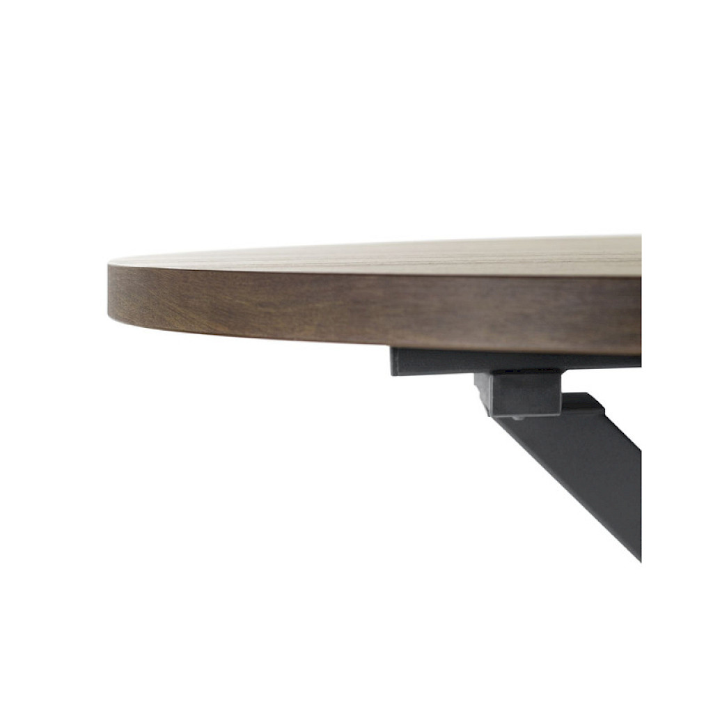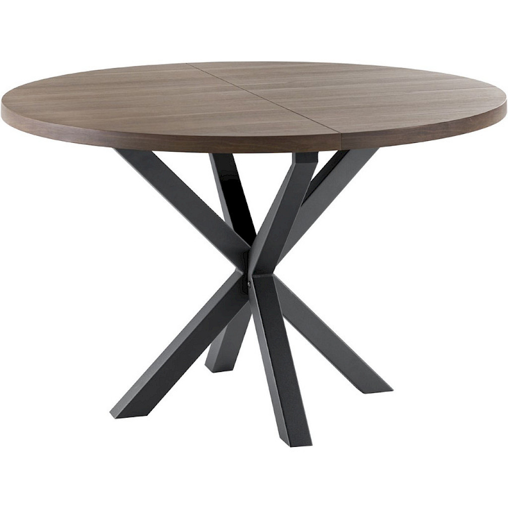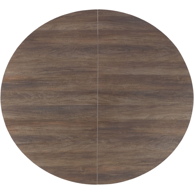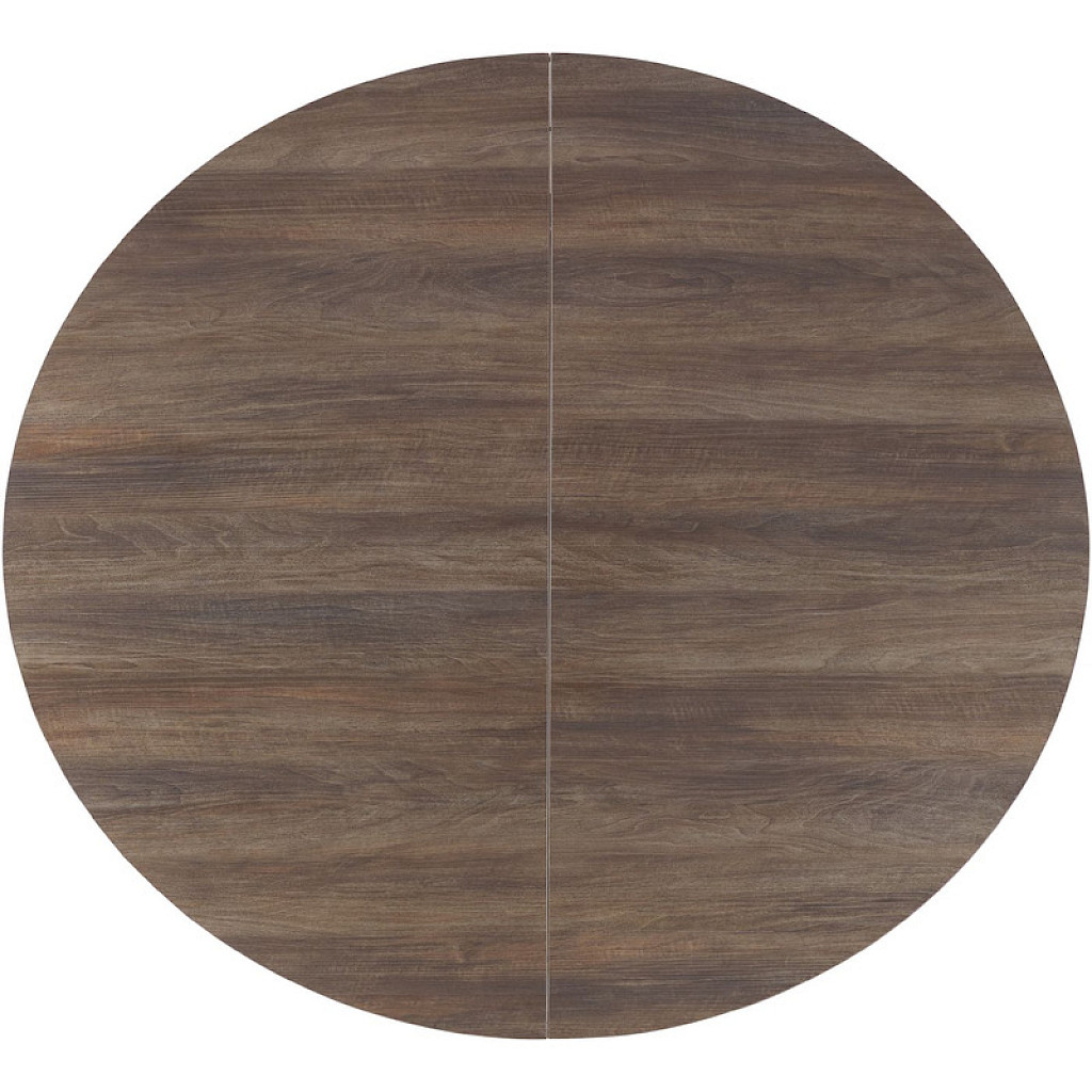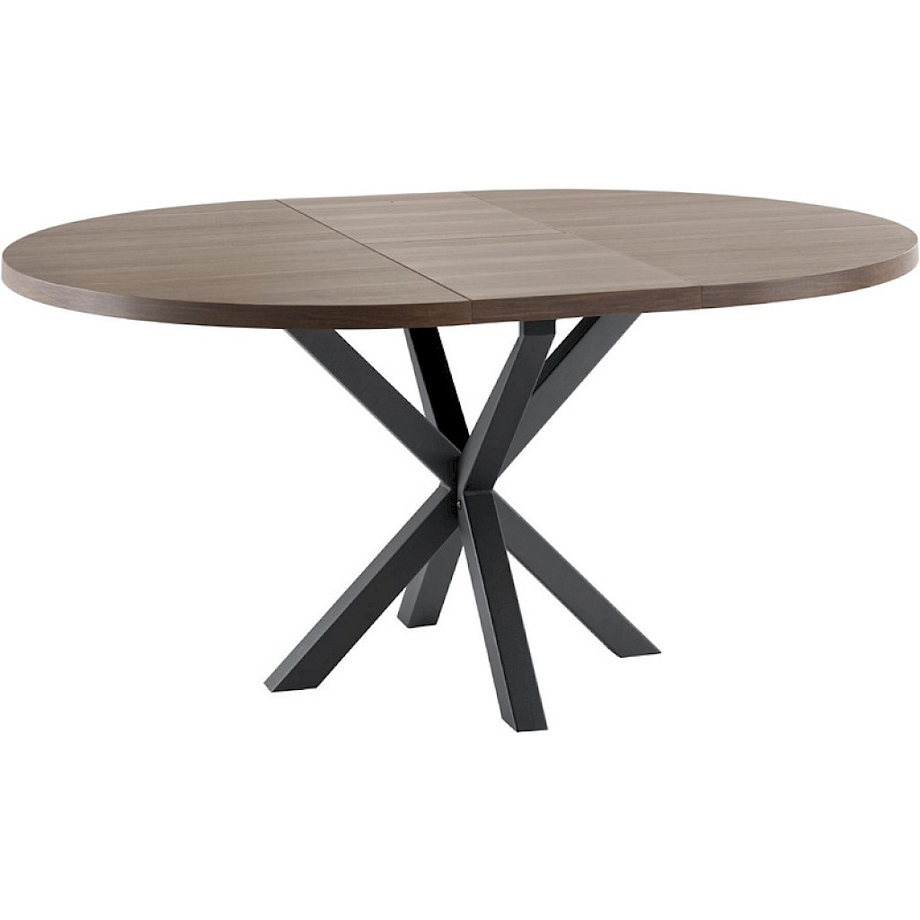 Deze eettafel heeft een rond blad in de kleur medium bruin en een zwarte metalen spinpoot. De tafel heeft een doorsnede van 130 cm breed en bij het uitschuiven een lengte van 170 cm, waardoor je in totaal zeker 4 tot 6 stoelen aan deze tafel kwijt kunt. De hoogte tot de onderkant van de tafel is ca. 69 cm; dit is belangrijk als je er armstoelen aan wilt zetten. De eettafel is uitstekend te combineren met de andere meubelen uit de Sparcia serie.