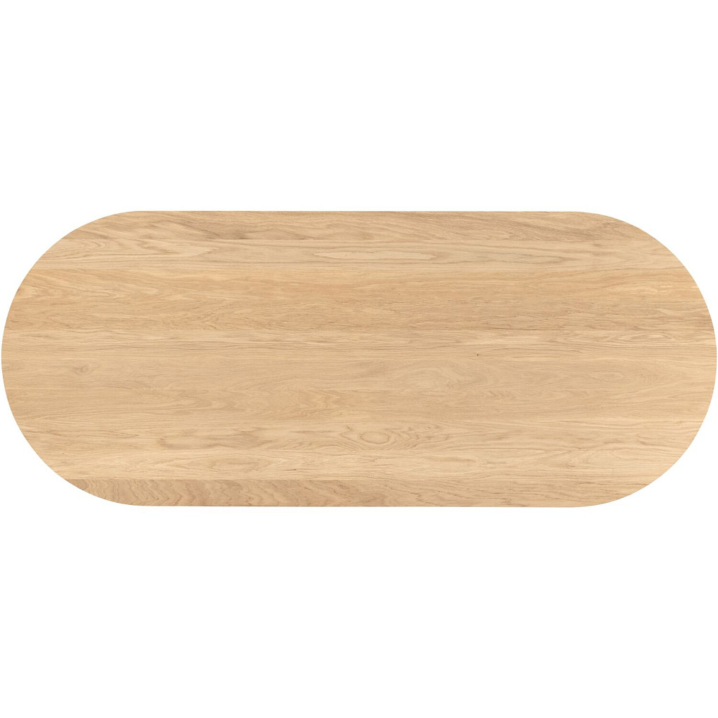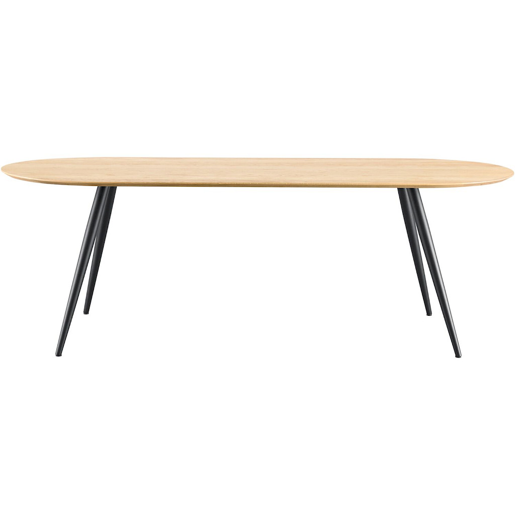 Eettafel Tabiro heeft een mooie ranke uitstraling en een tijdloos design zodat hij altijd in jouw interieur past. Het tafelblad is gemaakt van massief eikenhout en afgewerkt met een kleurlak. Het ovalen blad van deze uitvoering heeft een afgeschuinde bladrand. Het mooie naturelle bovenblad is voorzien van een transparante lak, om de natuurlijk uitstraling van het hout de behouden. Deze uitvoering is voorzien van slanke zwarte metalen 2-standen poten in een conische vorm, want de tafel een verfijnde look geef.