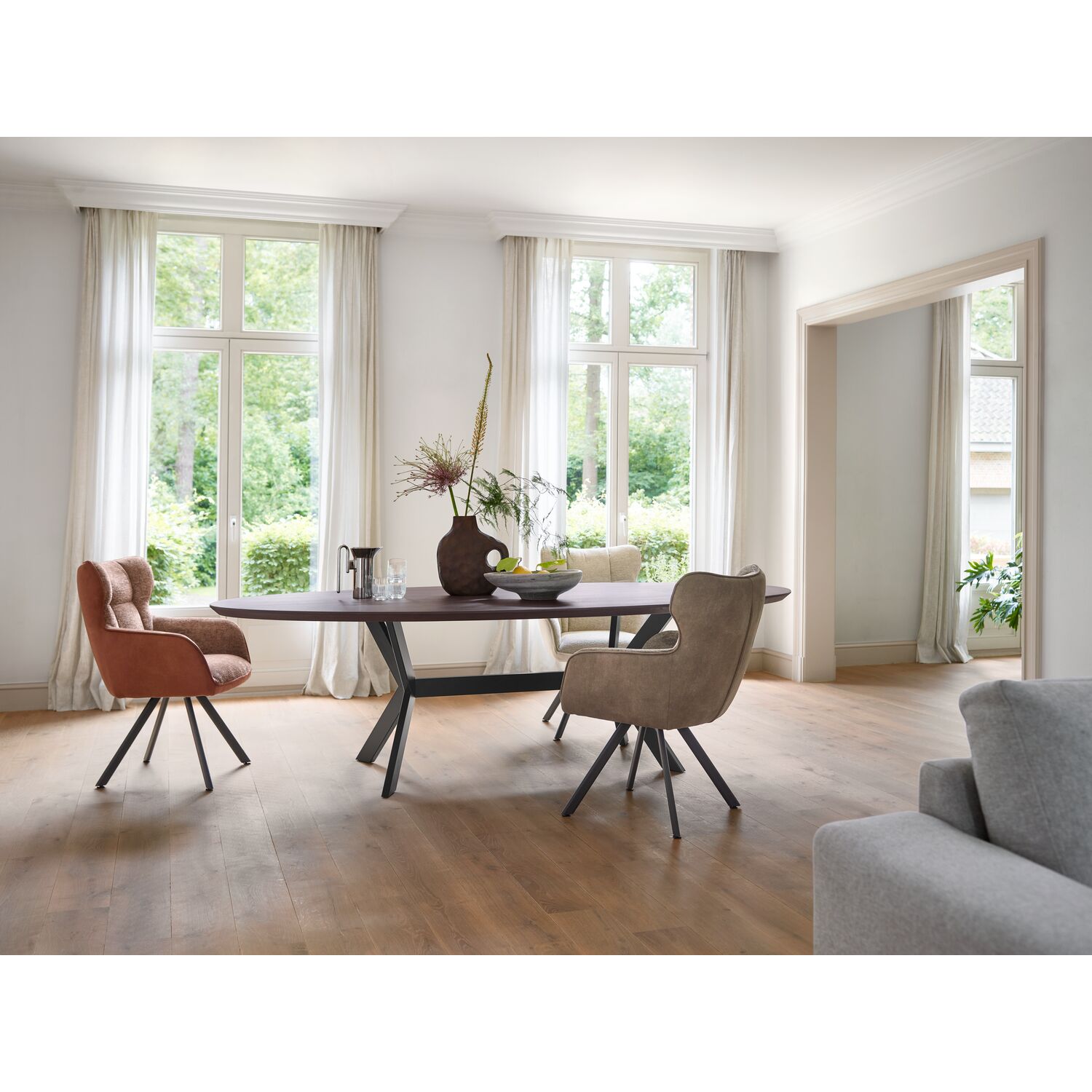 Eettafel Taranto is er eentje met 1001 mogelijkheden. Deze bruine eikenhouten tafel is voorzien van een ovaalvormig bovenblad en zwart metalen vlinderpoot wat de Taranto een moderne look geeft. Met een lengte van 260 cm kun je er gemakkelijk 6 tot 8 personen aan kwijt.