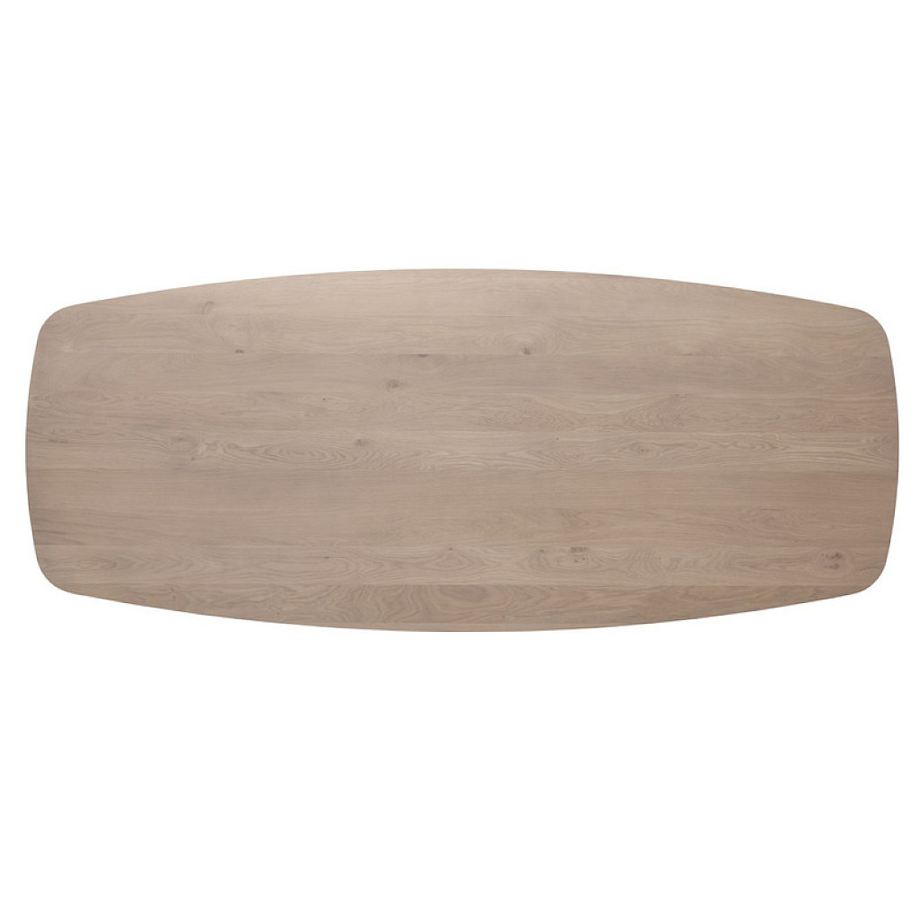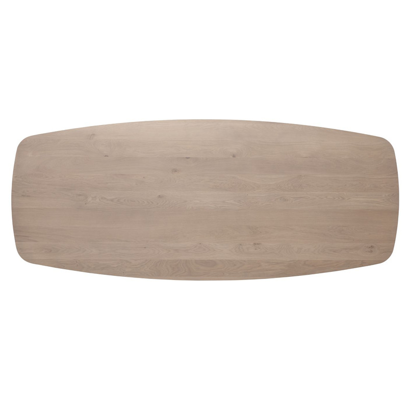 Deze uitvoering heeft een Deens ovaal afgeschuind tafelblad van 240x100 cm in een lichtbruine kleur, en een zwart metalen spinpoot. Omdat een Deens ovaal tafelblad geen scherpe hoeken heeft, biedt het meer ruimte voor gasten en stoelen rondom de tafel. De hoogte tot de onderkant van het blad is ca. 71,5 cm. Houd dit in de gaten als je stoelen met armleuningen aan de tafel wilt zetten.