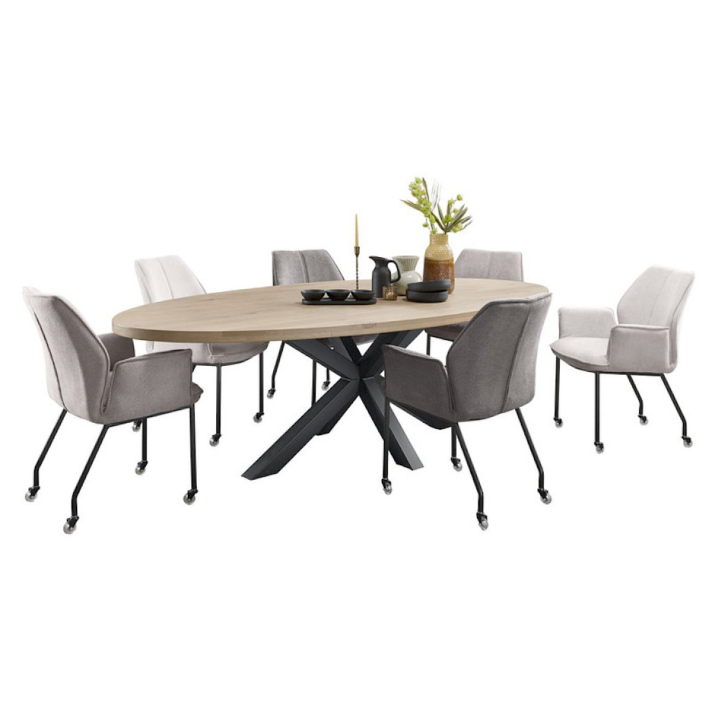 Deze uitvoering heeft een ovaal vlak tafelblad van 260x125 cm in een lichte grijs-bruine kleur, en een zwart metalen spinpoot. De hoogte tot de onderkant van het blad is ca. 71 cm. Houd dit in de gaten als je stoelen met armleuningen aan de tafel wilt zetten.