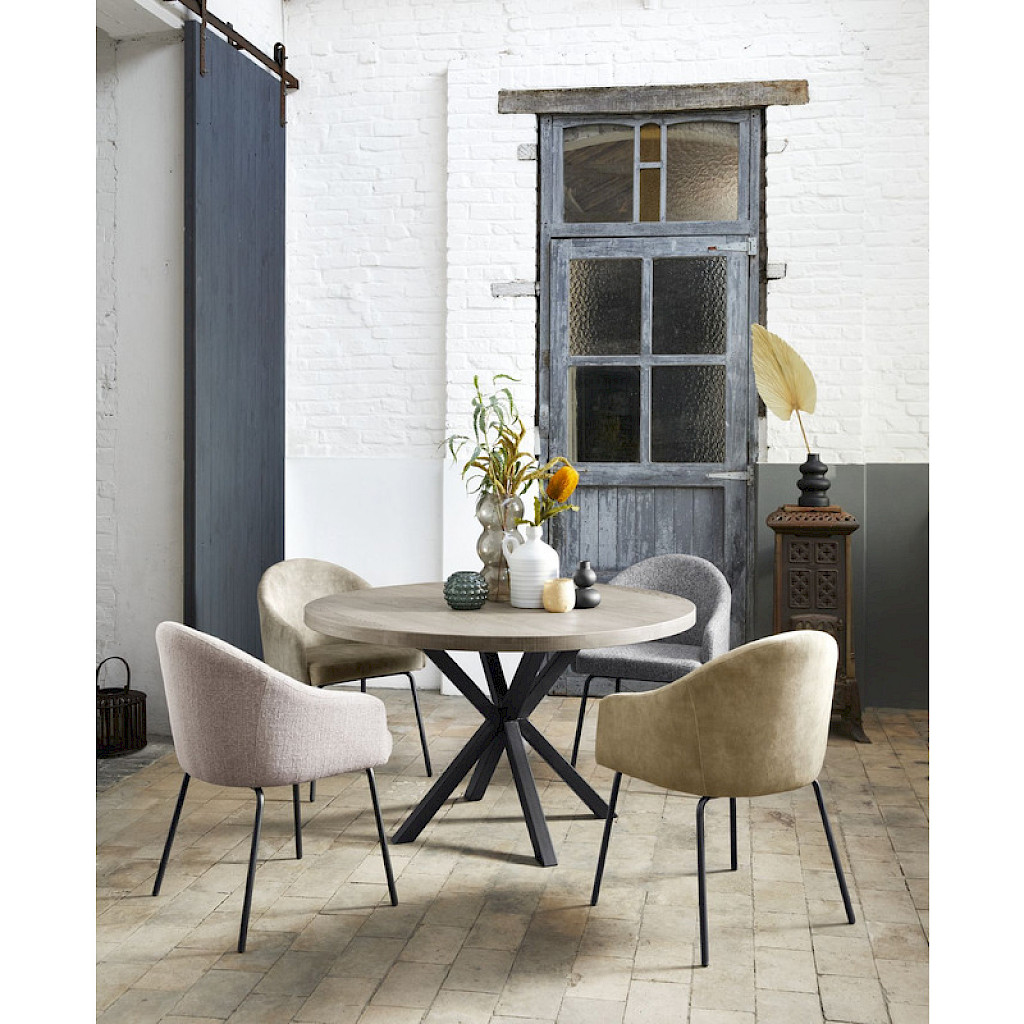 Deze uitvoering heeft een rond vlak tafelblad van 130 cm in een bruine kleur met grijze ondertoon, en een zwart metalen spinpoot. Het blad is afgewerkt met olie. De hoogte tot de onderkant van het blad is ca. 71 cm. Houd dit in de gaten als je stoelen met armleuningen aan de tafel wilt zetten.