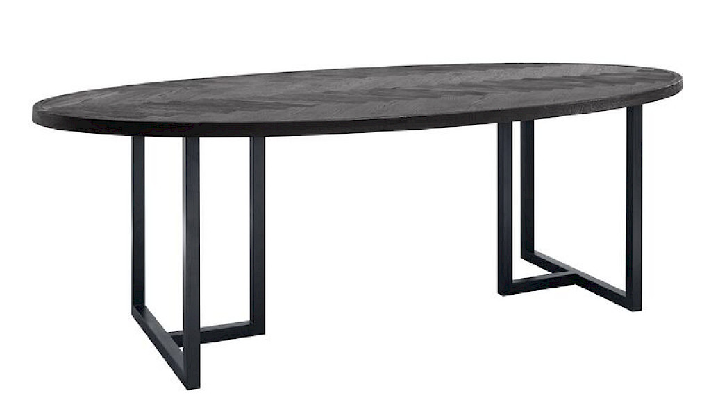 Ovalen eetkamertafel met zwarte metalen T-poten van 4x4 cm uitgevoerd in eiken fineer zwart met visgraat motief. De afmetingen zijn H78xB100xL200cm. Deze stoere eetkamertafel geeft een industriële look binnen je interieur. De hoogte vanaf de grond tot de onderkant is ongeveer 73cm. De eetkamertafel is ook beschikbaar in een grotere maat (230x110cm) of met een rechthoekig blad (160cm, 190cm of 220cm). Het blad kan daarnaast ook in eiken fineer naturel geleverd worden. Je dient enkel de poten nog eventjes te monteren.