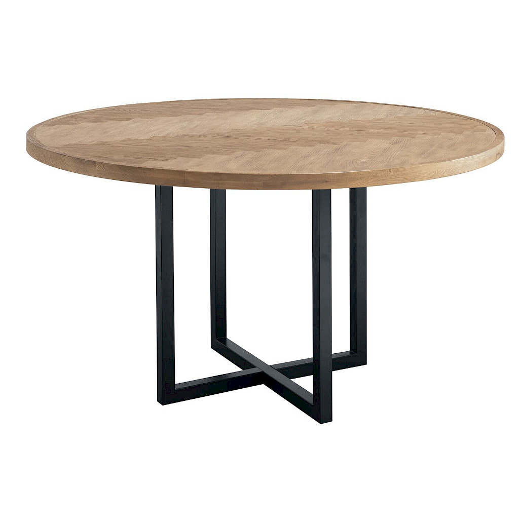 Ronde eetkamertafel met zwarte metalen T-poten van 4x4 cm uitgevoerd in eiken fineer naturel met visgraat motief. De afmetingen zijn H78xØ140m. Deze stoere eetkamertafel geeft een industriële look binnen je interieur. De hoogte vanaf de grond tot de onderkant is ongeveer 73cm. De eetkamertafel is ook beschikbaar met een ovalen blad (200x100cm of 230x110cm) of met een rechthoekig blad (160cm, 190cm of 220cm). Het blad kan daarnaast ook in geheel zwart geleverd worden. Je dient enkel de poten nog eventjes te monteren.
