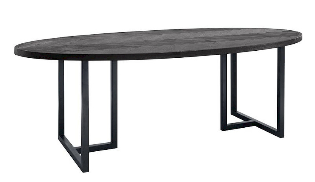 Ovaal, uitgevoerd met een blad in eiken fineer zwart met visgraat motief en zwarte metalen T-poten 4x4 cm OP=OP