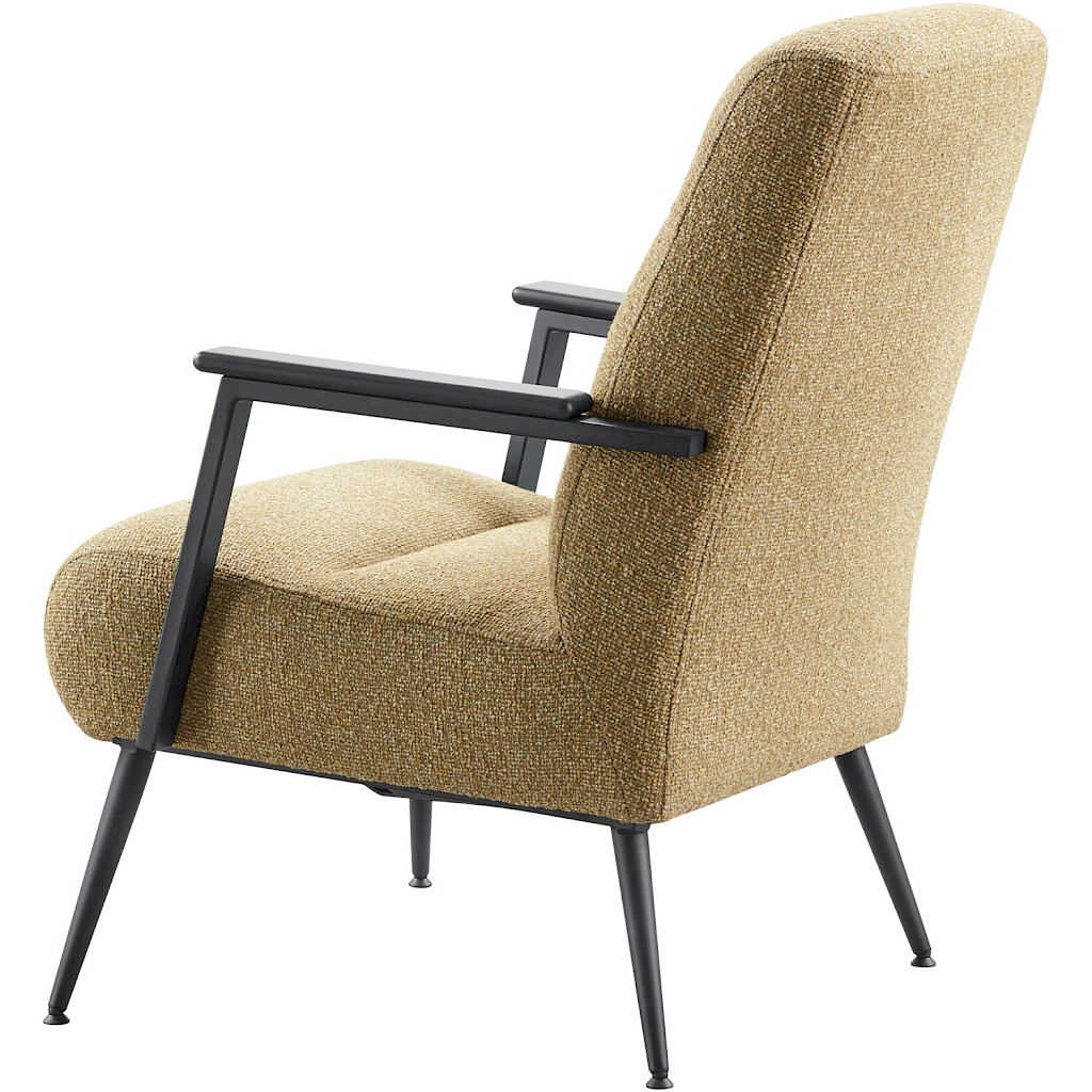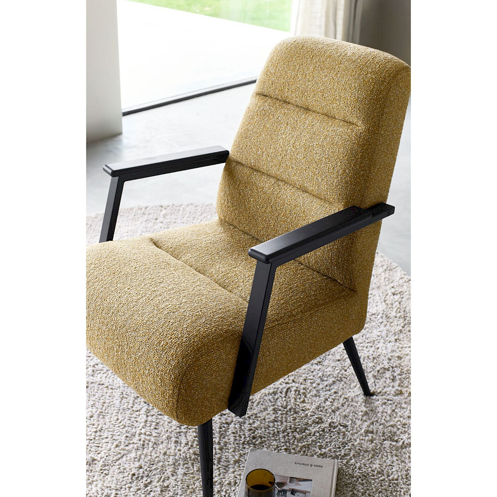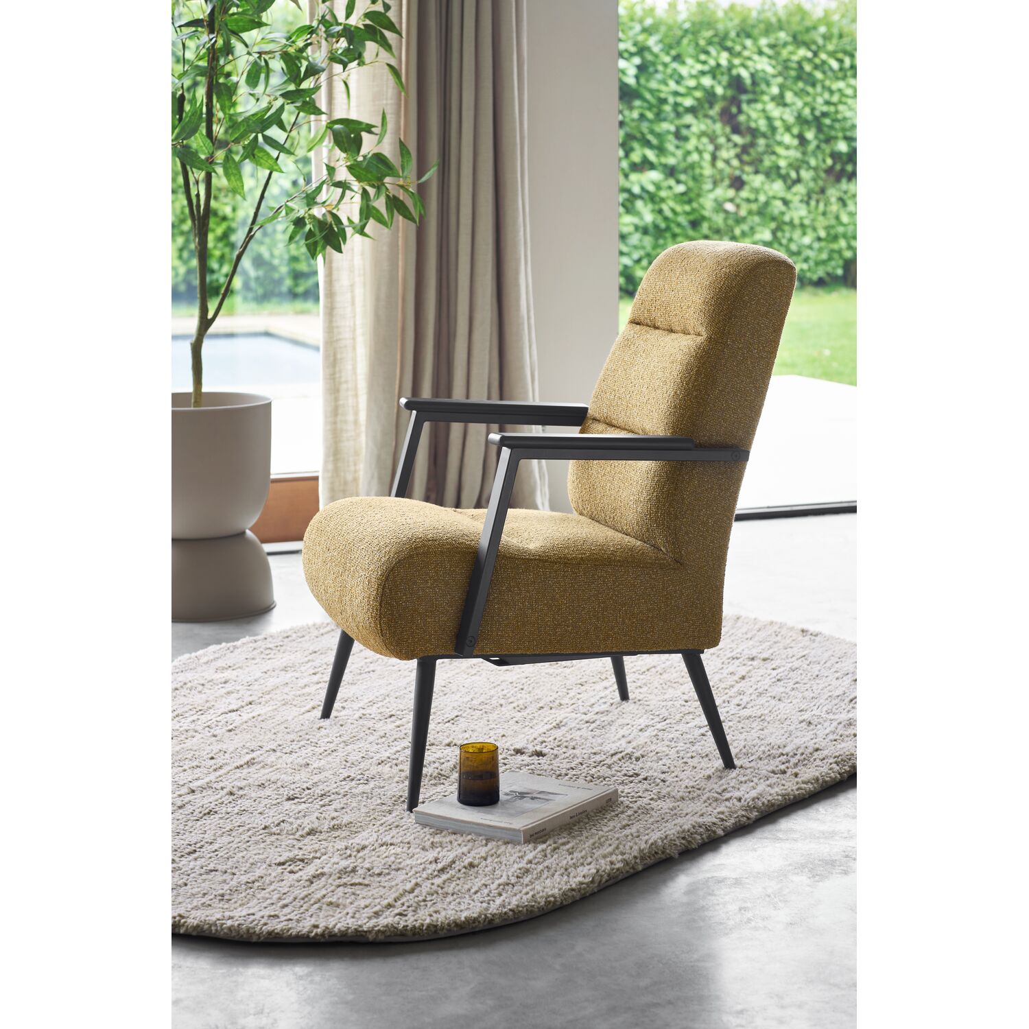 Fauteuil Atika zit geweldig en biedt een ruime keuze aan mogelijkheden. Dit model is gestoffeerd in een trendy okergele bouclé stof en voelt heerlijk zacht aan. Atika beschikt over metalen open armleuningen met zwarte houten armlegger, een lage rugleuning en zwarte metalen poten.