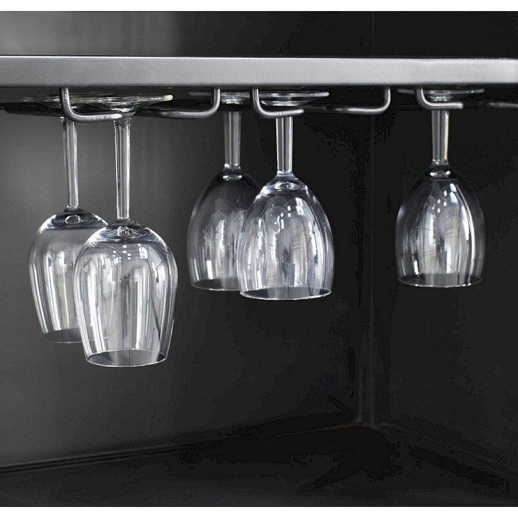 Laat je wijnglazen schitteren in stijl met ons metalen glazenrek. Dit slimme opbergaccessoire is ontworpen om jouw prachtige wijnglazen veilig en elegant te presenteren, en het kan moeiteloos worden gemonteerd onder een legplank in jouw Orizone opbergkast of vitrinekast. Het rek haak je gemakkelijk in de gaatjes onder de legplank door middel van de pinnetjes op het rek.