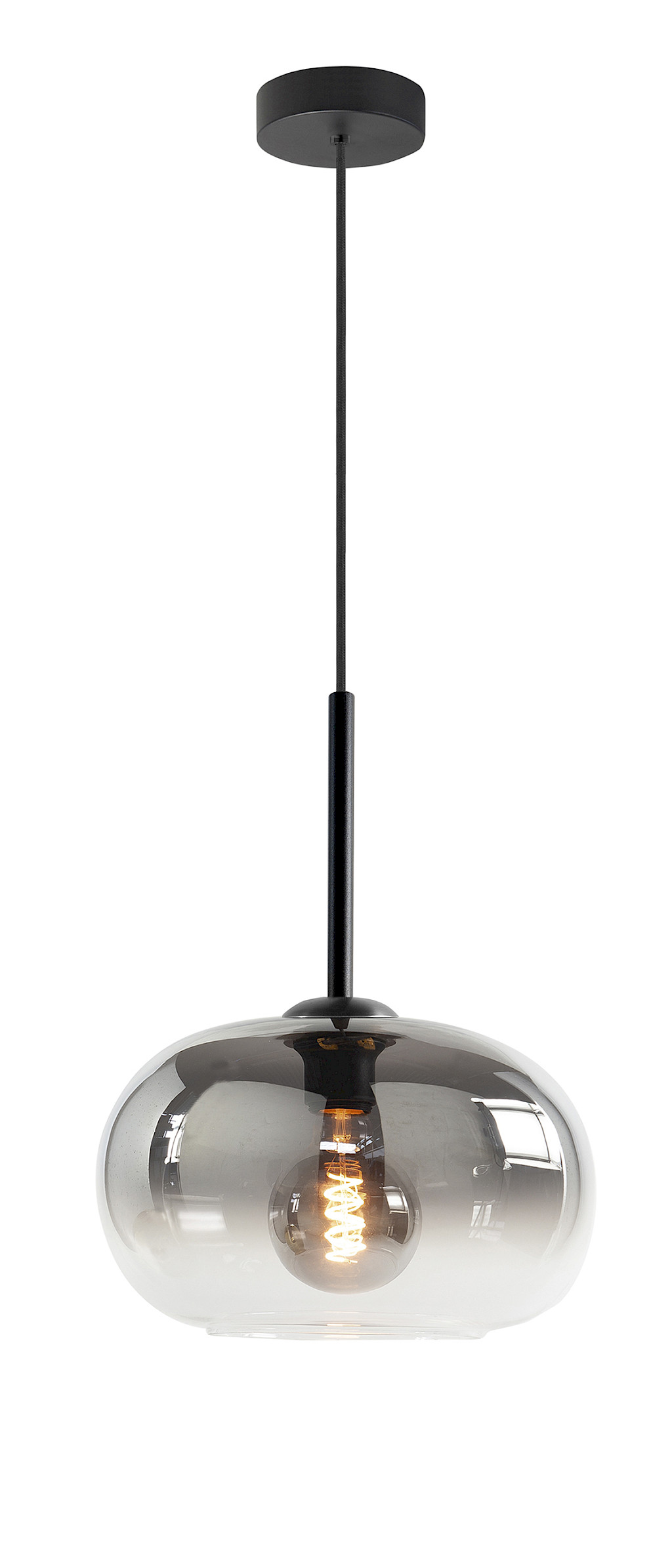 Hanglamp Bellini zwart + smoke glas met 1 lichtpunt en Ø 10 cm. Deze lamp wordt geleverd zonder lichtbron(nen). Als lichtbron kan zowel een gloei- als LED lamp worden gebruikt. Dimbaar via externe dimmer.