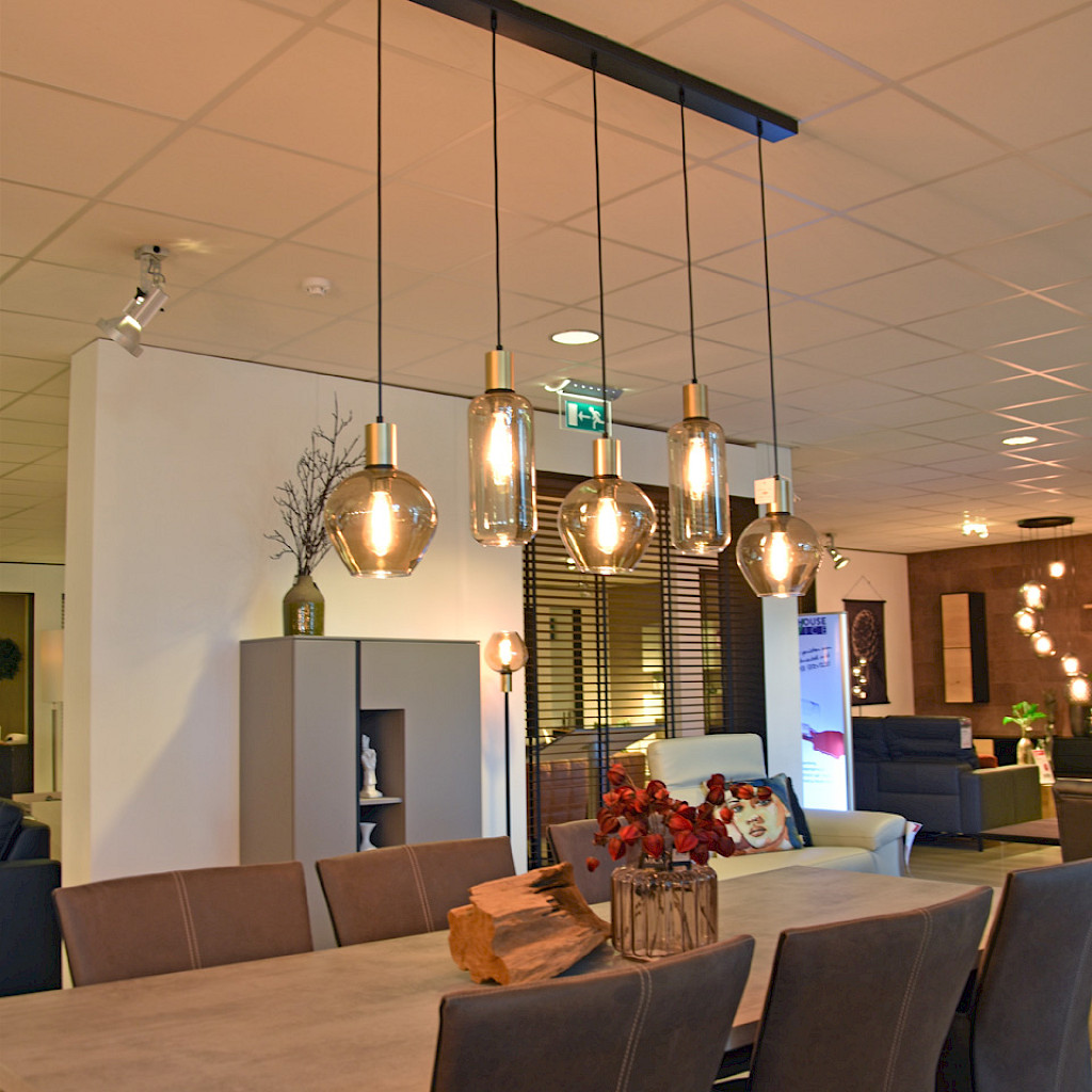 Hanglamp Bounty is een echte blikvanger. De hanglamp heeft vijf prachtige lichtpunten. Twee soorten glazen lampen die het licht mooi en gelijkmatig verspreiden.