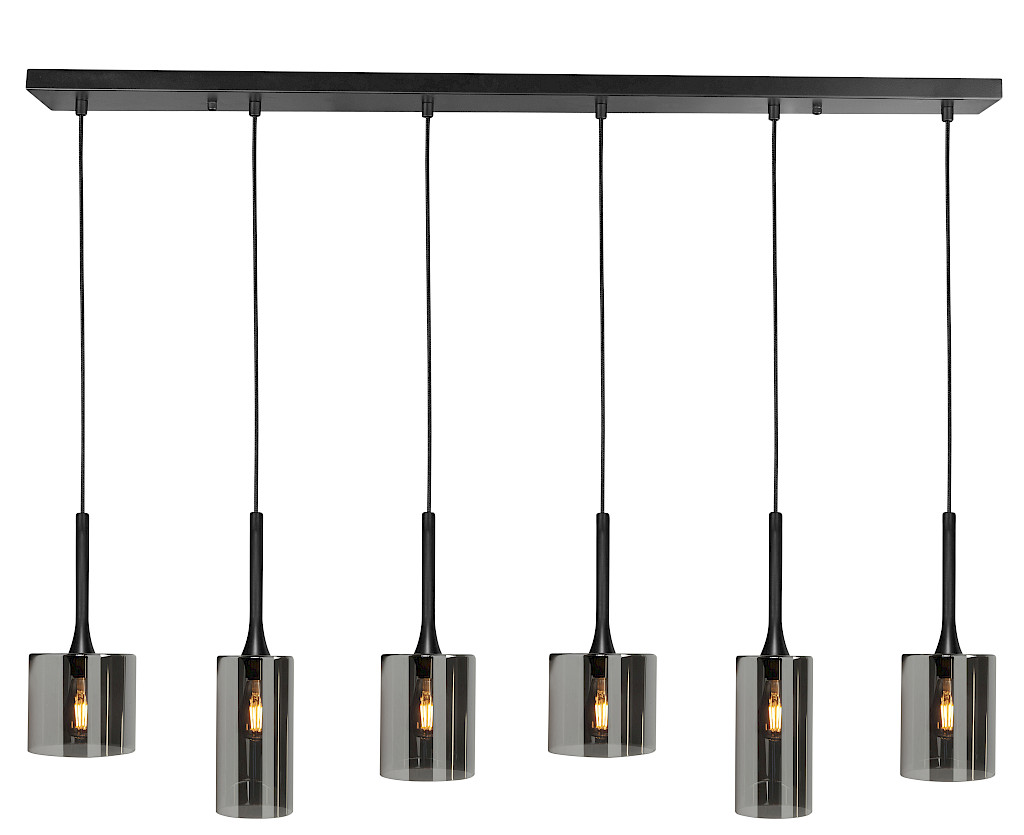Hanglamp Diverso zwart + smoke glas 6 lichtpunten . Deze lamp wordt geleverd zonder lichtbron(nen). Als lichtbron kan zowel een gloei- als LED lamp worden gebruikt. Dimbaar via externe dimmer.