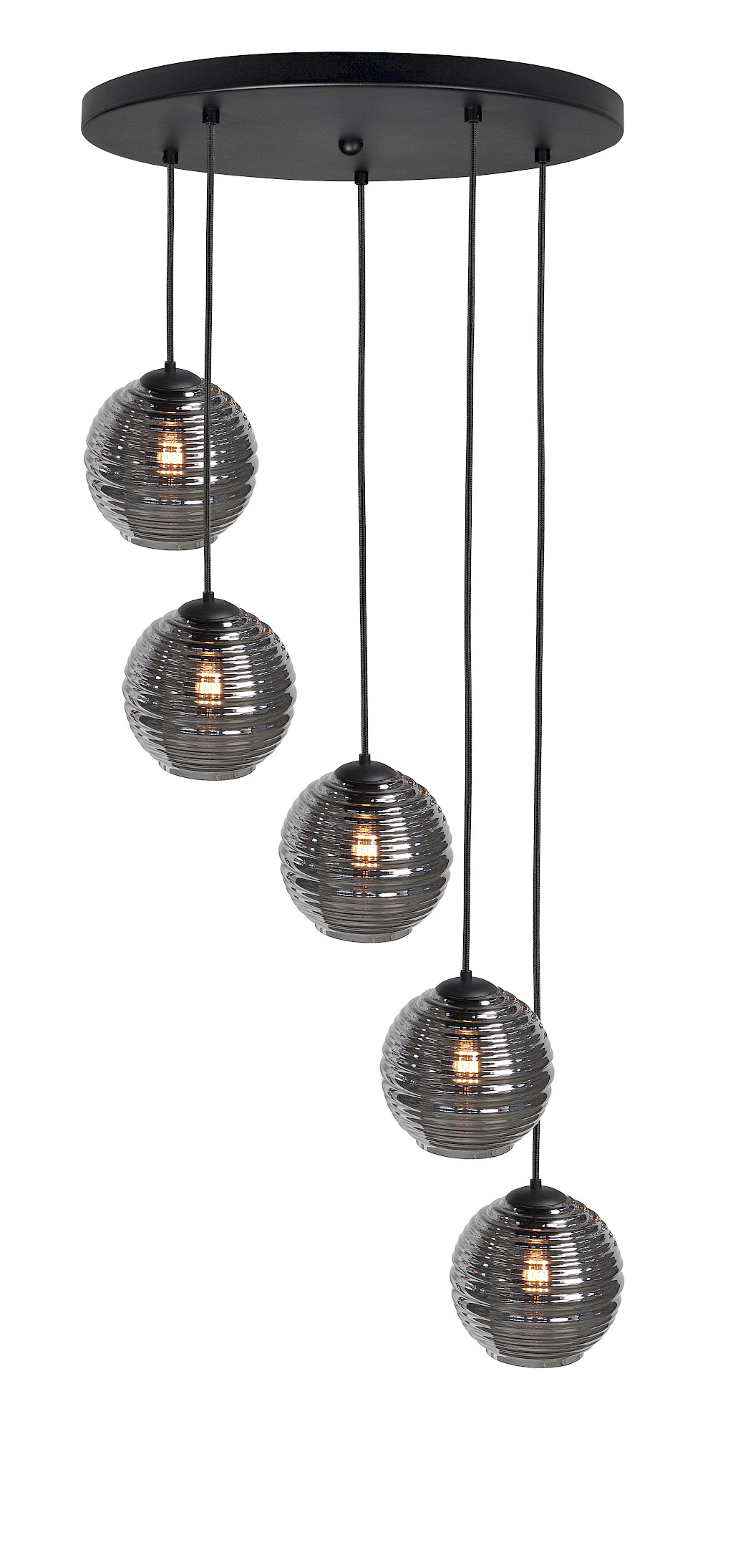 Hanglamp Fantasy rond zwart + smoke glas 5 lichtpunten en Ø 45 cm. Deze lamp wordt geleverd zonder lichtbron(nen). Als lichtbron kan zowel een gloei- als LED lamp worden gebruikt. Dimbaar via externe dimmer.