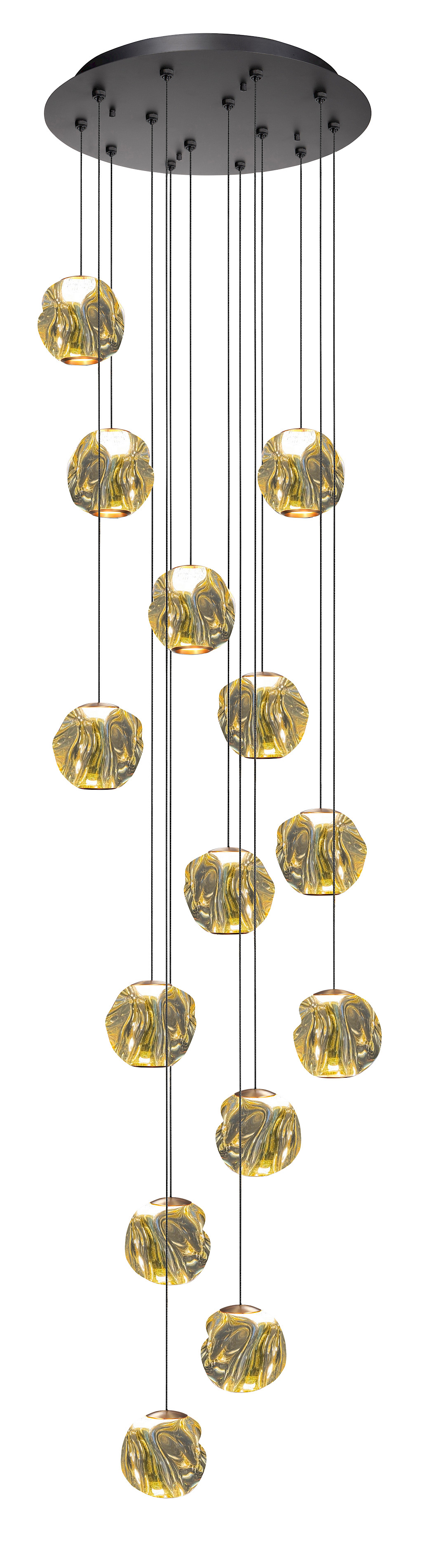Hanglamp Melina zwart + messing + amber acryl 14 lichtpunten Via een persoonlijk gesprek worden dan alle wensen besproken.