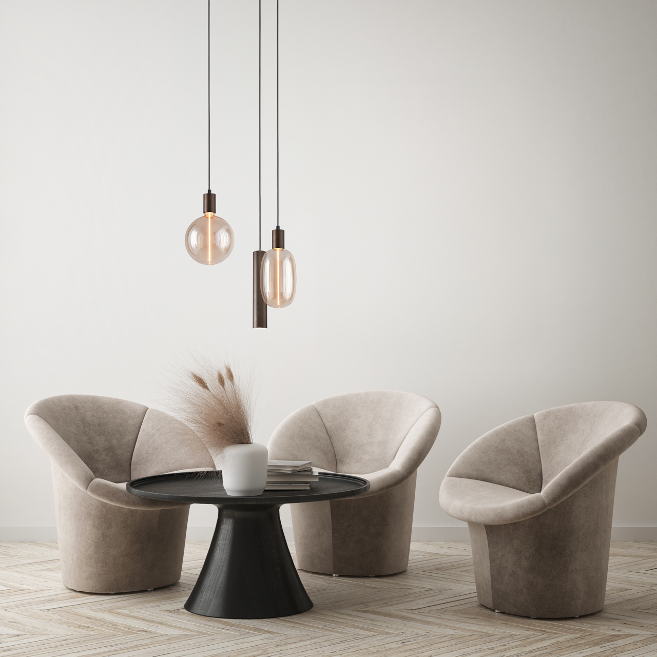 In een interieur waar warmte en elegantie samenkomen, zweeft de Tence 3-lichts hanglamp als een verfijnd statement boven tafel. Met haar drie royale lampenkappen van elk 35 centimeter doorsnee, vult ze de ruimte niet alleen met licht, maar ook met karakter. De rijke kleur 15 Cacao – diep, aards en zacht glanzend – geeft de lamp een warme, luxueuze uitstraling die doet denken aan fluweelzachte chocolade of de gloed van hout bij schemerlicht.