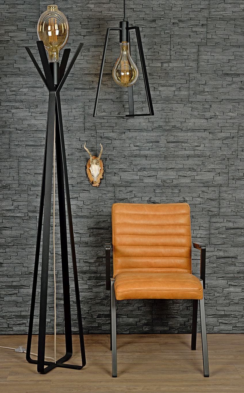Het stoere frame wordt gecombineerd met een aansprekende lichtbron. De lamp is gemaakt van metaal en in structuur zwart (RAL 9005) gespoten.