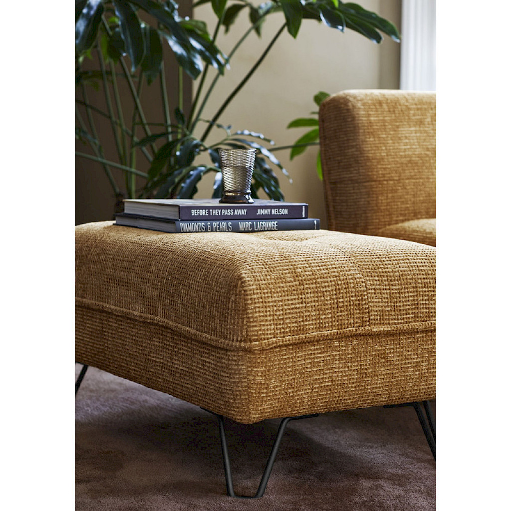 Hocker Sontino is gestoffeerd met een grovere goudkleurige weefstof, in combinatie met de zwarte metalen V-vormige draadpoten geeft dit de hocker een moderne, maar elegante uitstraling. Deze prachtige hocker past perfect 3 zitsbank Sontino in kleur gold. Ideaal om te gebruiken als voetenbank als je even heerlijk wilt relaxen, maar ook te gebruiken als extra zitplaats.
