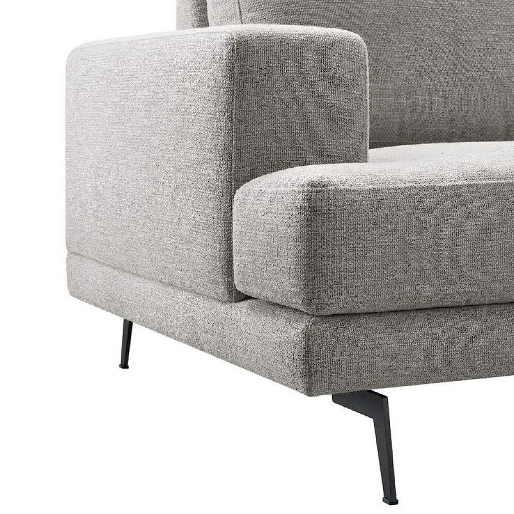 Model Acante kenmerkt zich door zijn eigentijdse uitstraling, waardoor deze in vrijwel ieder interieur past. De bank is gestoffeerd met een grijs gemêleerde weefstof. Door het gebruik van verschillende garens en tinten ontstaat een licht meerkleurige kwaliteit met een ietwat grovere structuur die zacht en vol aanvoelt. De hoge, metalen poten zorgen voor een moderne en luchtige uitstraling.