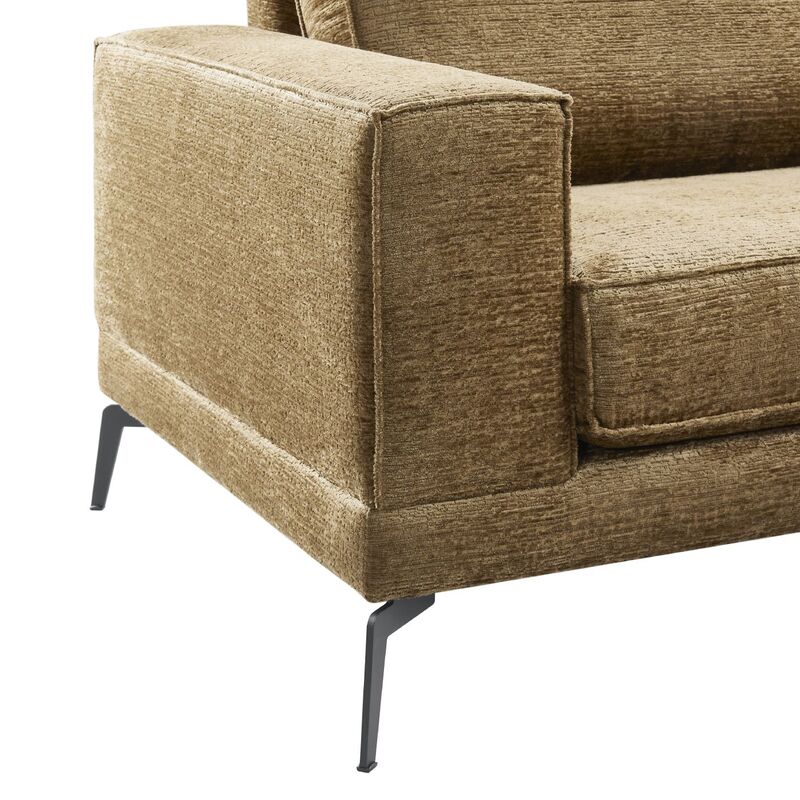 Met deze hoekbank haal je een echte eyecatcher in huis! De stof waarmee deze bank bekleed is, is van hoge kwaliteit en voelt heerlijk zacht aan. Bovendien zit er een licht 3D effect in, waardoor deze een volumineuze en luxe uitstraling heeft. De kleur laat zich het beste omschrijven als bruin, maar neigt naar het groen en heeft een gouden nuance. De strakke lijnen van dit model worden geaccentueerd door de zwart metalen designpoten en de gesloten vlindernaad waarmee de armleuningen en kussens zijn afgewerkt. Zie jij deze bank al bij jou thuis staan schitteren?