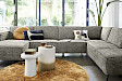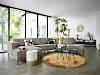 De getoonde versie is uitgevoerd in stof renegade in de kleur plumb en bestaat uit een hoek met eiland, 2,5 zits zonder armen en een longchair.