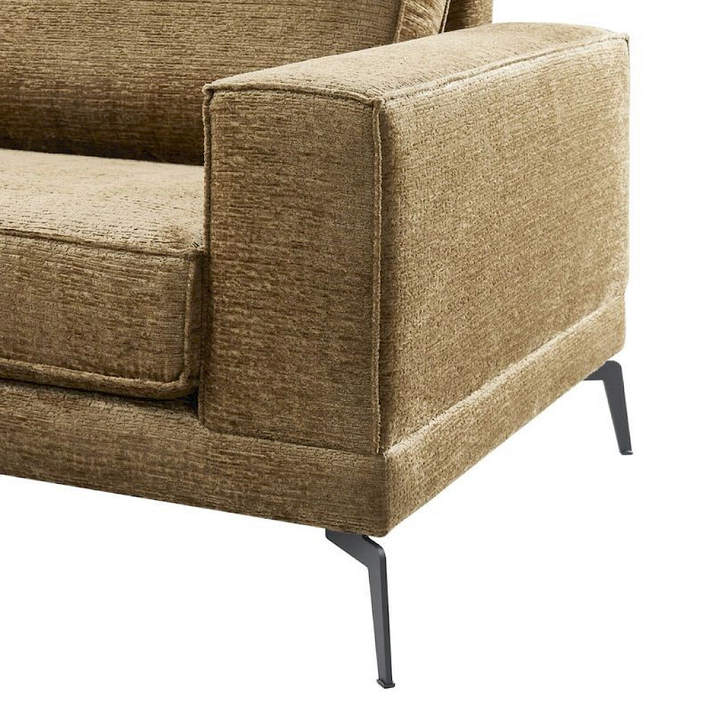 Met deze hoekbank haal je een echte eyecatcher in huis! De stof waarmee deze bank bekleed is, is van hoge kwaliteit en voelt heerlijk zacht aan. Er zit een licht 3D effect in, wat zorgt voor een volumineuze en luxe uitstraling. De kleur laat zich het beste omschrijven als bruin, maar neigt naar het groen en heeft een gouden nuance. De strakke lijnen van dit model worden geaccentueerd door de zwart metalen designpoten en de gesloten vlindernaad waarmee de armleuningen en kussens zijn afgewerkt. Zie jij deze bank al bij jou thuis staan schitteren?