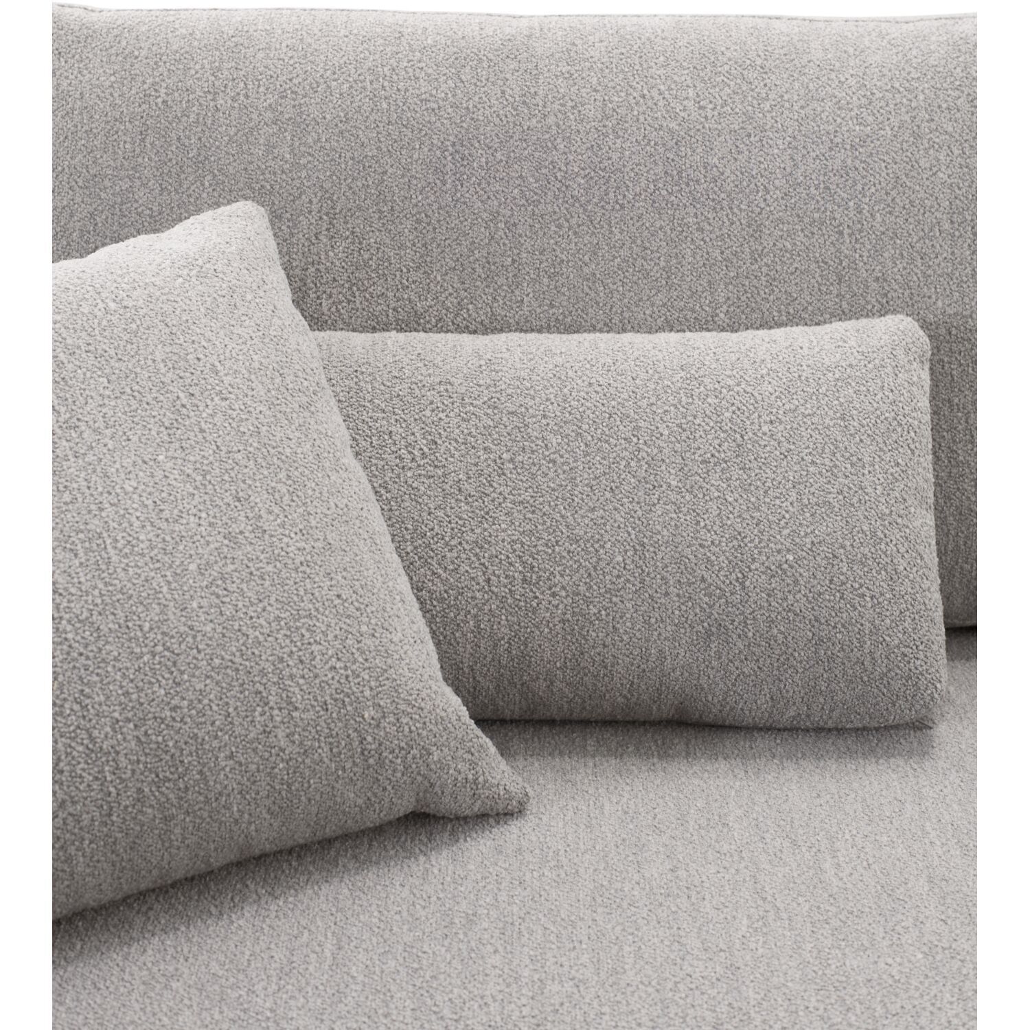 De hoekbank Arnad valt direct op door zijn afgeronde vormen en een landelijke twist. De bank is bekleed met de grijs gemêleerde boucléstof Alpine, die bestaat uit los geweven patronen, draden en lussen, wat zorgt voor een speels, onregelmatig effect. Ondanks de structuur voelt de stof zacht aan. De bank staat op lage, zwarte kunststof pootjes die discreet onder het ontwerp verdwijnen.