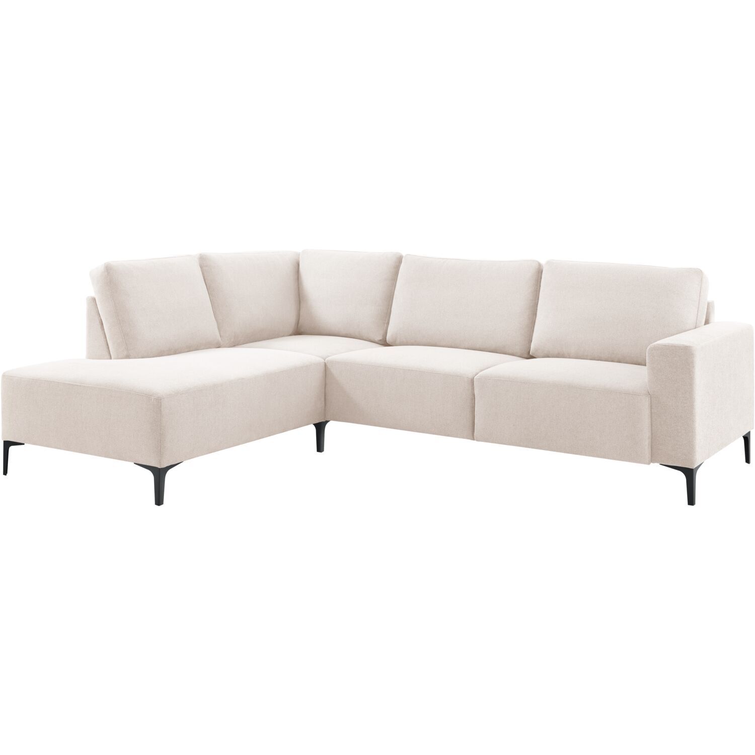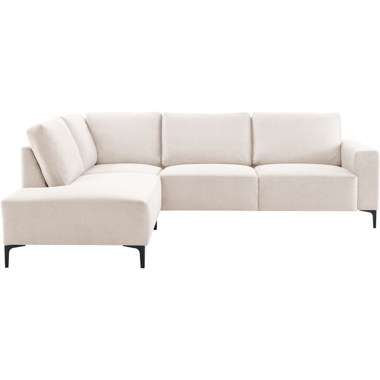 De zitting en kussens van deze bank zijn gevuld met veerkrachtig polyetherschuim, dat zorgt voor een aangename ondersteuning en een licht stevige zit. Dit maakt de bank ideaal voor ontspannen momenten, terwijl de kussens toch goed in vorm blijven. De hoekbank staat op stevige metalen poten in zwart met een hoogte van 15 cm, die zorgen voor een stabiele basis en een stoere touch. De poten worden los meegeleverd en zijn eenvoudig zelf te monteren.