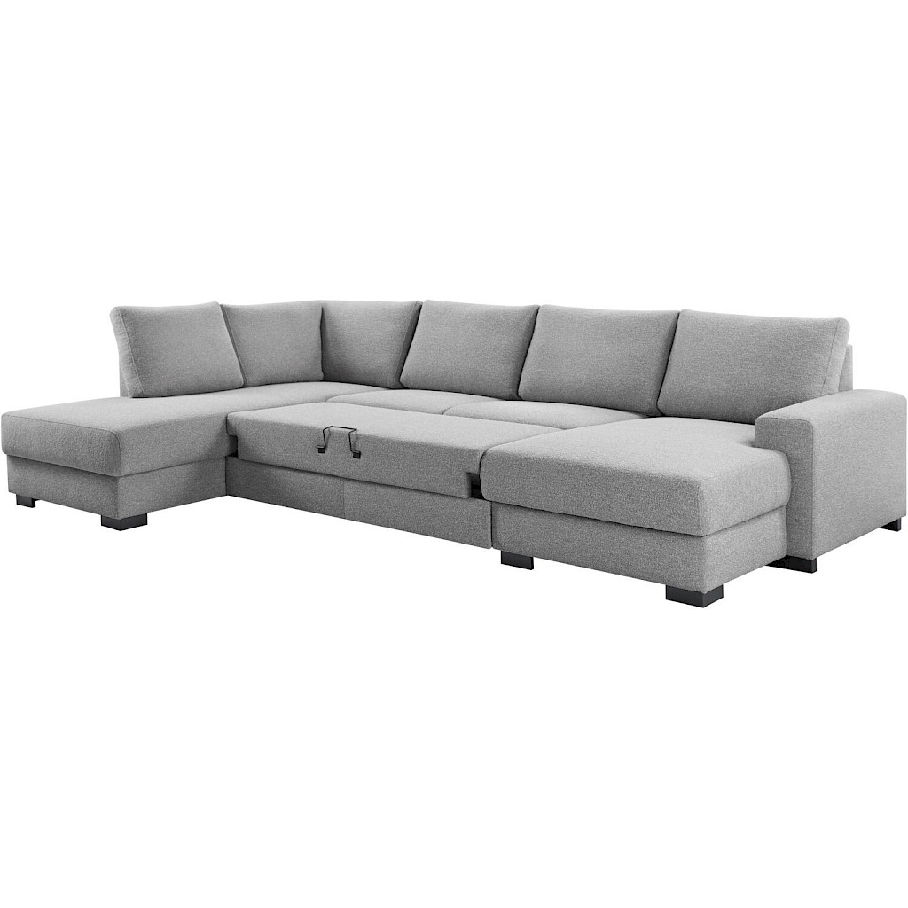 Hoek met eiland groot links + 2,5 zits zonder armen (met slaap-/relaxfunctie) + chaise longue arm rechts (met opbergruimte), uitgevoerd in stof lodge 149-steel, polyetherschuim in de zitting, mix van polyetherschuim- en siliconenvlokken in de rug en zwarte houten poten (hoogte 6 cm).
