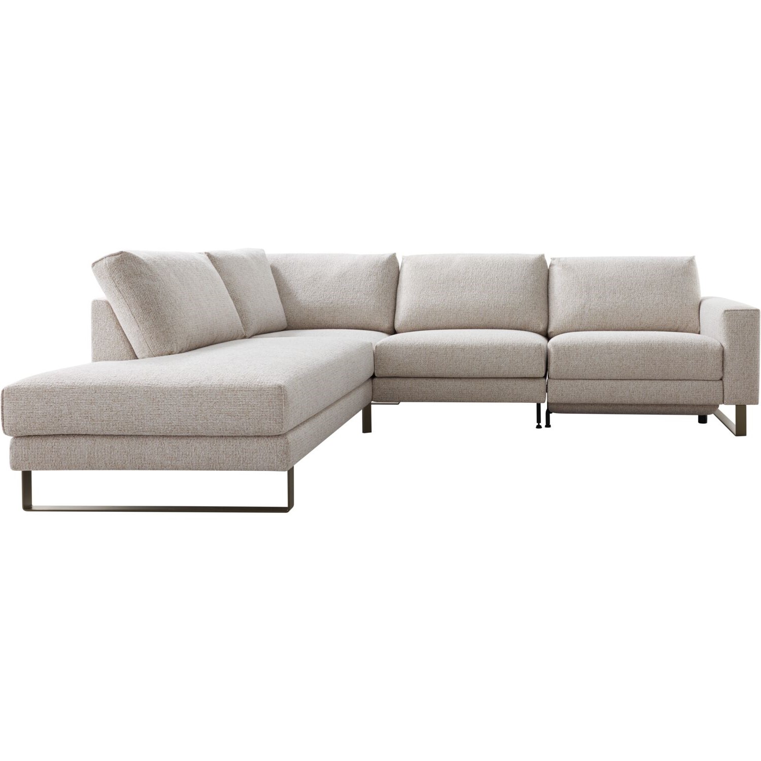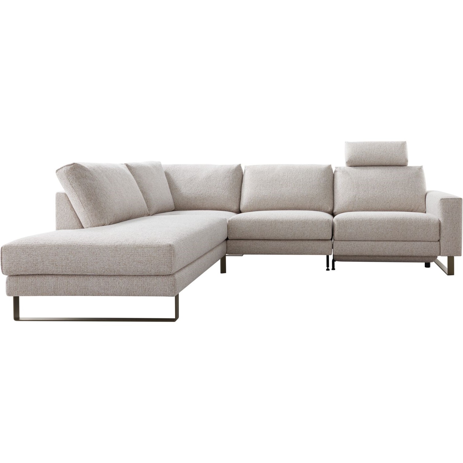 Hoek met eiland links + 1 zits 80 zonder armen + 1 zits 80 arm rechts met elektrische relaxfunctie en verstelbare hoofdsteun 60 cm in stof taurus 01-naturel met bonellvering met een toplaag van HR-koudschuim in de zitting, een mix van polyetherschuim- en