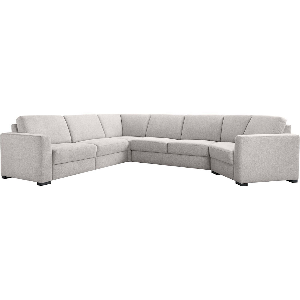 1 zits (80) arm links met elektrische relaxfunctie + 1 zits (80) zonder armen + kleine hoek + 2 zits zonder armen met verstelbare zitdiepte + trapeze element arm rechts, uitgevoerd in stof mito 180-dolphin met arm B, HR-koudschuim in de zitting, polyetherschuim in de rug en zwarte houten poten type HF1.