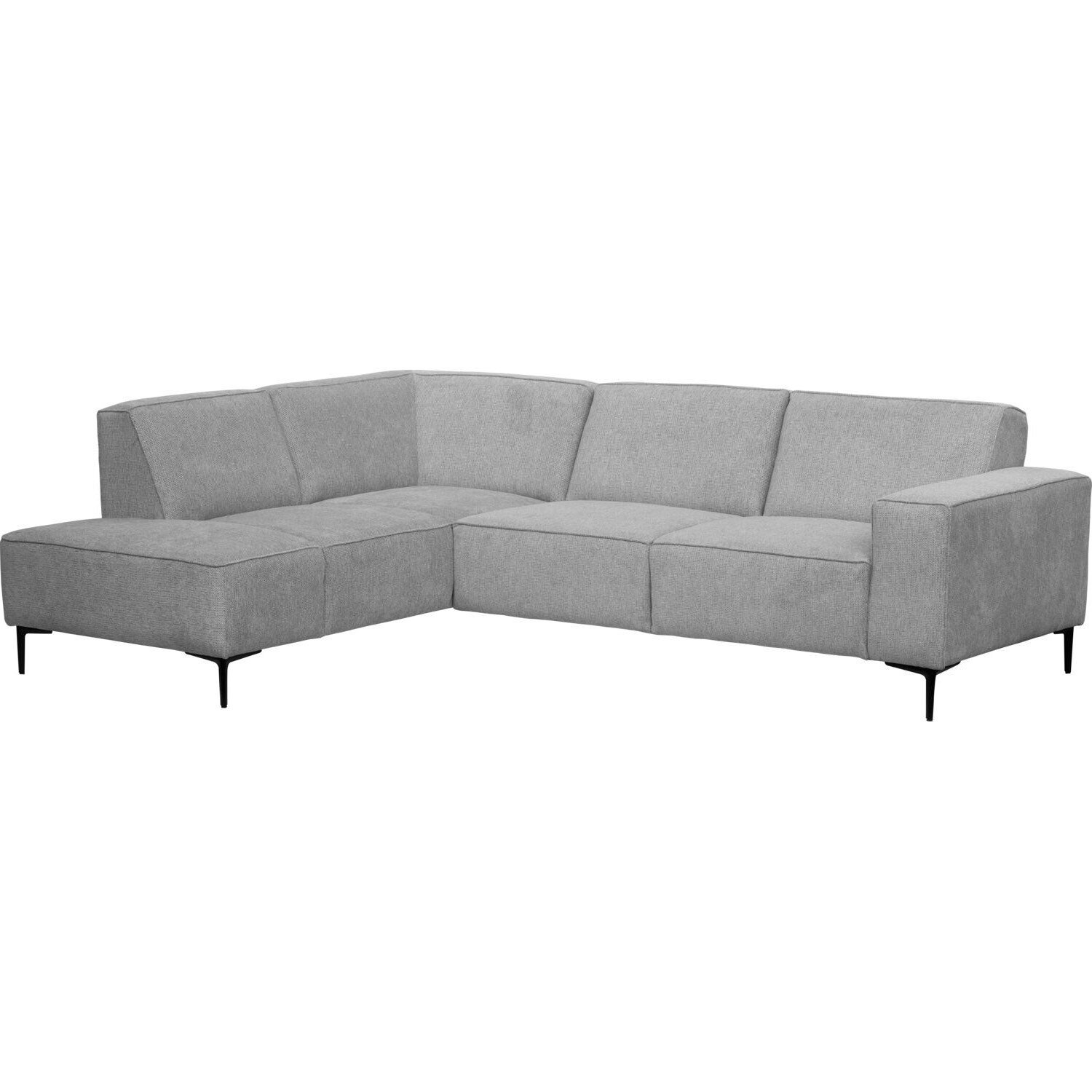 Hoek met eiland links + 2,5 zits arm rechts, uitgevoerd in stof glow 14-silver met polyetherschuim in de zitting, polyetherschuim in de rug en zwart metalen poten (hoogte 15,5 cm).