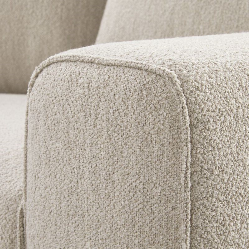 Hoekbank Linoza is een prachtige, moderne bank voorzien van losse zit- en rugkussens en met een hoogwaardig zitcomfort. Het trapeze-element maakt van deze bank een echte eyecatcher en de mooie belijning van deze hoekbank wordt extra geaccentueerd door de prachtige gesloten vlindernaad waarmee de kussens en armleuningen zijn afgewerkt. De bank is gestoffeerd in de beige gemêleerde bouclé stof alpine. Bouclé stof bestaat uit los geweven patronen, draden en lussen. Ondanks de onregelmatige structuur die hierdoor ontstaat, voelt deze stof heerlijk zacht en warm aan. In combinatie met de zwarte metalen designpoten geeft dit de bank een eigentijdse uitstraling en past hierdoor in elk modern interieur.