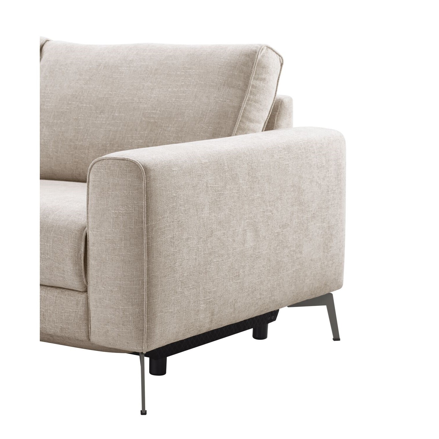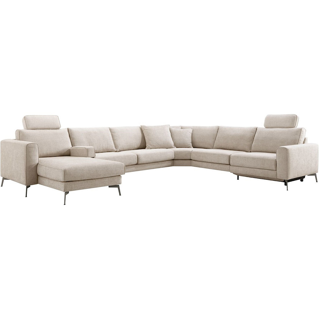 Hoekbank Linoza heeft een moderne en luxueuze uitstraling dankzij de royale vorm en de karakteristieke vlindernaad. De bank is uitgevoerd in een beige-grijze weefstof met verschillende kleurnuances en een subtiele glans, wat zorgt voor een warme en levendige uitstraling. De zachte structuur van de stof draagt bij aan het comfortabele karakter van de bank. De donkergrijze metalen poten geven het geheel een eigentijdse en stijlvolle look.