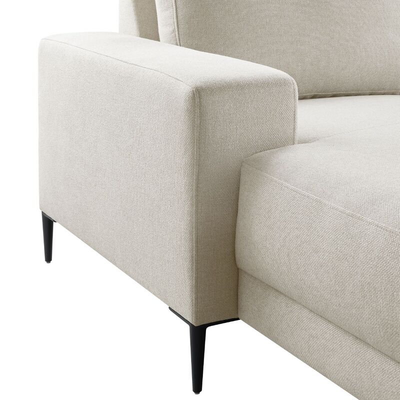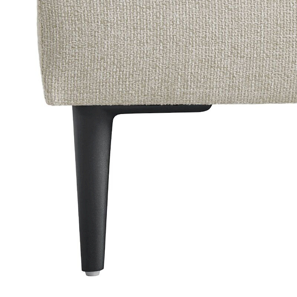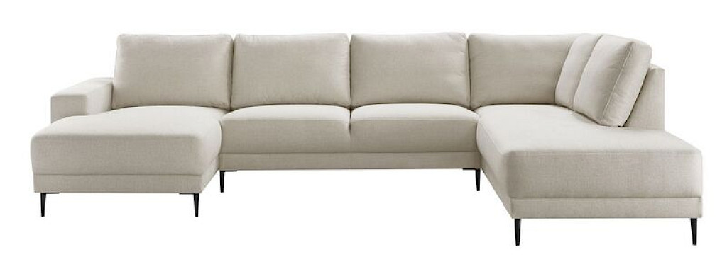 Hoekbank Portona heeft een luxe, comfortabele uitstraling door de volle rug- en zitkussens. De royale hoekbank is uitgevoerd in een trendy ecru kleurige stof. De stof is een fijne gemêleerde weefstof, die lekker zacht aanvoelt.