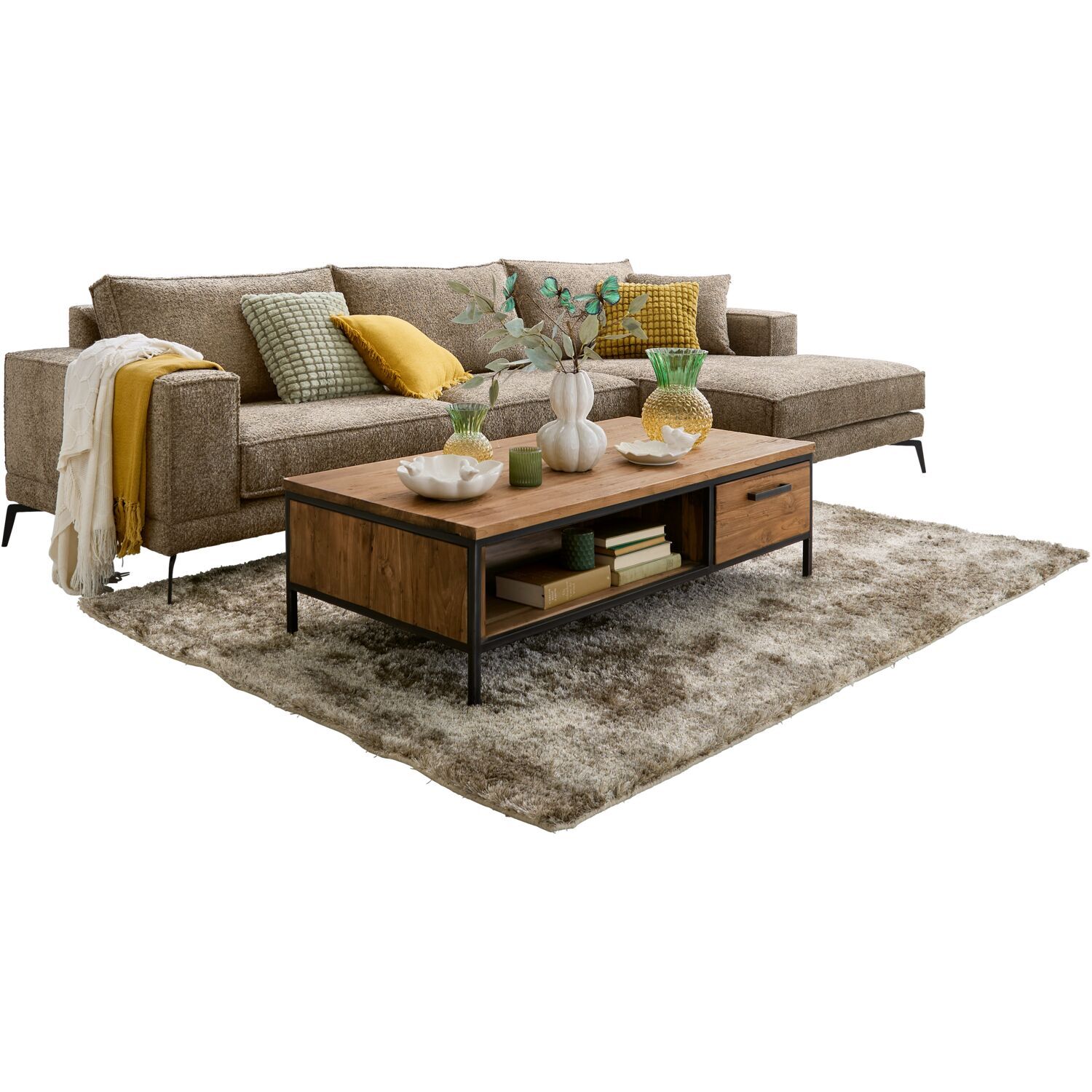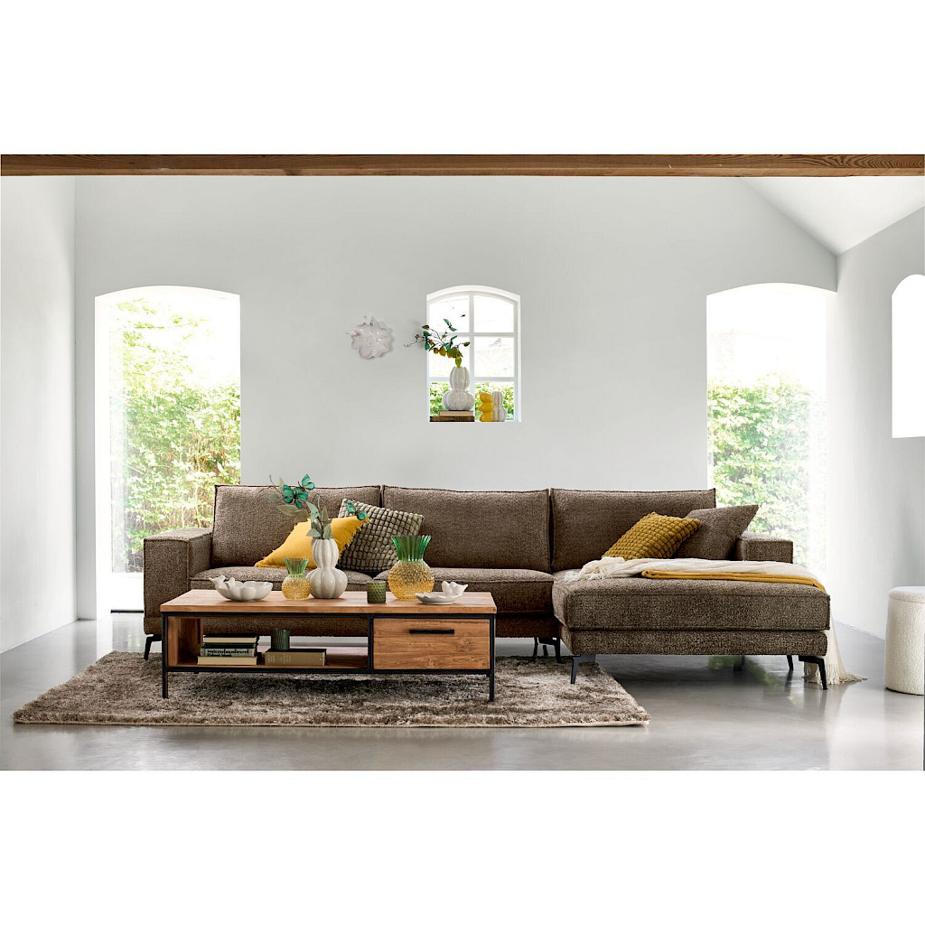 Een stijlvolle eyecatcher in huisMet deze hoekbank haal je een echte eyecatcher in huis. De bank is bekleed met een hoogwaardige weefstof die heerlijk zacht aanvoelt en een subtiel 3D-effect heeft. Dit zorgt voor een volumineuze en luxe uitstraling. De kleur laat zich het beste omschrijven als bruin, met een grijs-groene vleug en een subtiele champagnekleurige draad. De strakke lijnen van het model worden fraai geaccentueerd door de gesloten vlindernaad langs de armleuningen en kussens. De moderne zwarte metalen designpoten maken het geheel helemaal af en geven de bank een eigentijdse, elegante uitstraling.