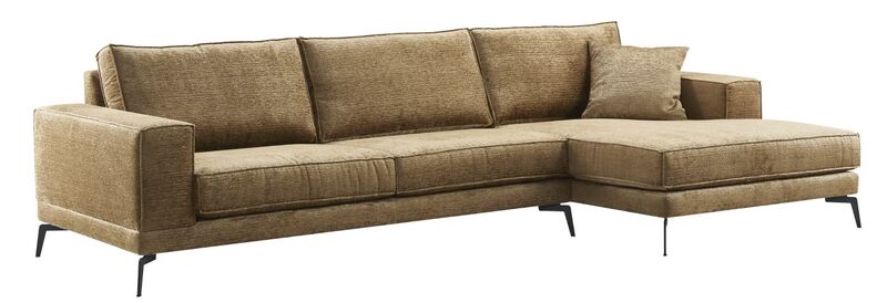 Met deze hoekbank haal je een echte eyecatcher in huis! De stof waarmee deze bank bekleed is, is van hoge kwaliteit en voelt heerlijk zacht aan. Er zit een licht 3D effect in, wat zorgt voor een volumineuze en luxe uitstraling. De kleur laat zich het beste omschrijven als bruin, maar neigt naar het groen en heeft een gouden nuance. De strakke lijnen van dit model worden geaccentueerd door de zwart metalen designpoten en de gesloten vlindernaad waarmee de armleuningen en kussens zijn afgewerkt. Zie jij deze bank al bij jou thuis staan schitteren?