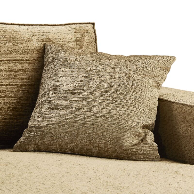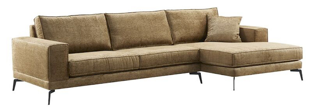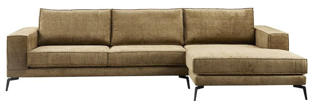 Met deze hoekbank haal je een echte eyecatcher in huis! De stof waarmee deze bank bekleed is, is van hoge kwaliteit en voelt heerlijk zacht aan. Er zit een licht 3D effect in, wat zorgt voor een volumineuze en luxe uitstraling. De kleur laat zich het beste omschrijven als bruin, maar neigt naar het groen en heeft een gouden nuance. De strakke lijnen van dit model worden geaccentueerd door de zwart metalen designpoten en de gesloten vlindernaad waarmee de armleuningen en kussens zijn afgewerkt. Zie jij deze bank al bij jou thuis staan schitteren?