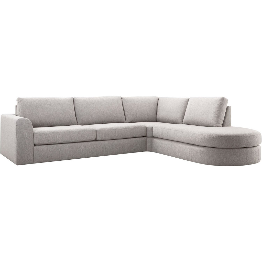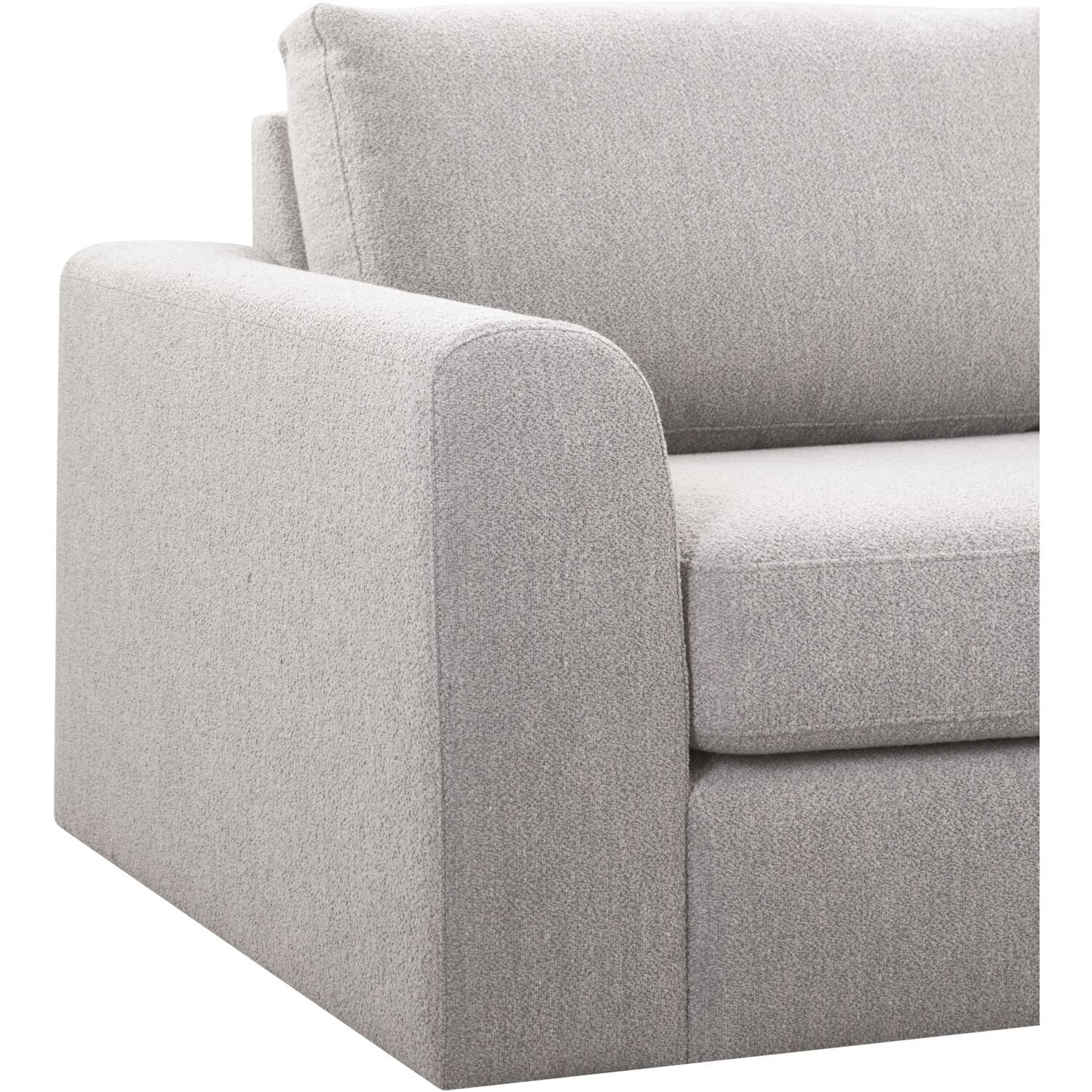 De hoekbank Arnad valt direct op door zijn afgeronde vormen en een landelijke twist. De bank is bekleed met de grijs gemêleerde boucléstof Alpine, die bestaat uit los geweven patronen, draden en lussen, wat zorgt voor een speels, onregelmatig effect. Ondanks de structuur voelt de stof zacht aan. De bank staat op lage, zwarte kunststof pootjes die discreet onder het ontwerp verdwijnen.