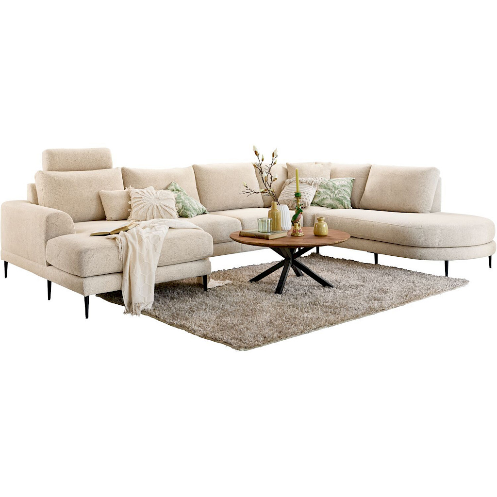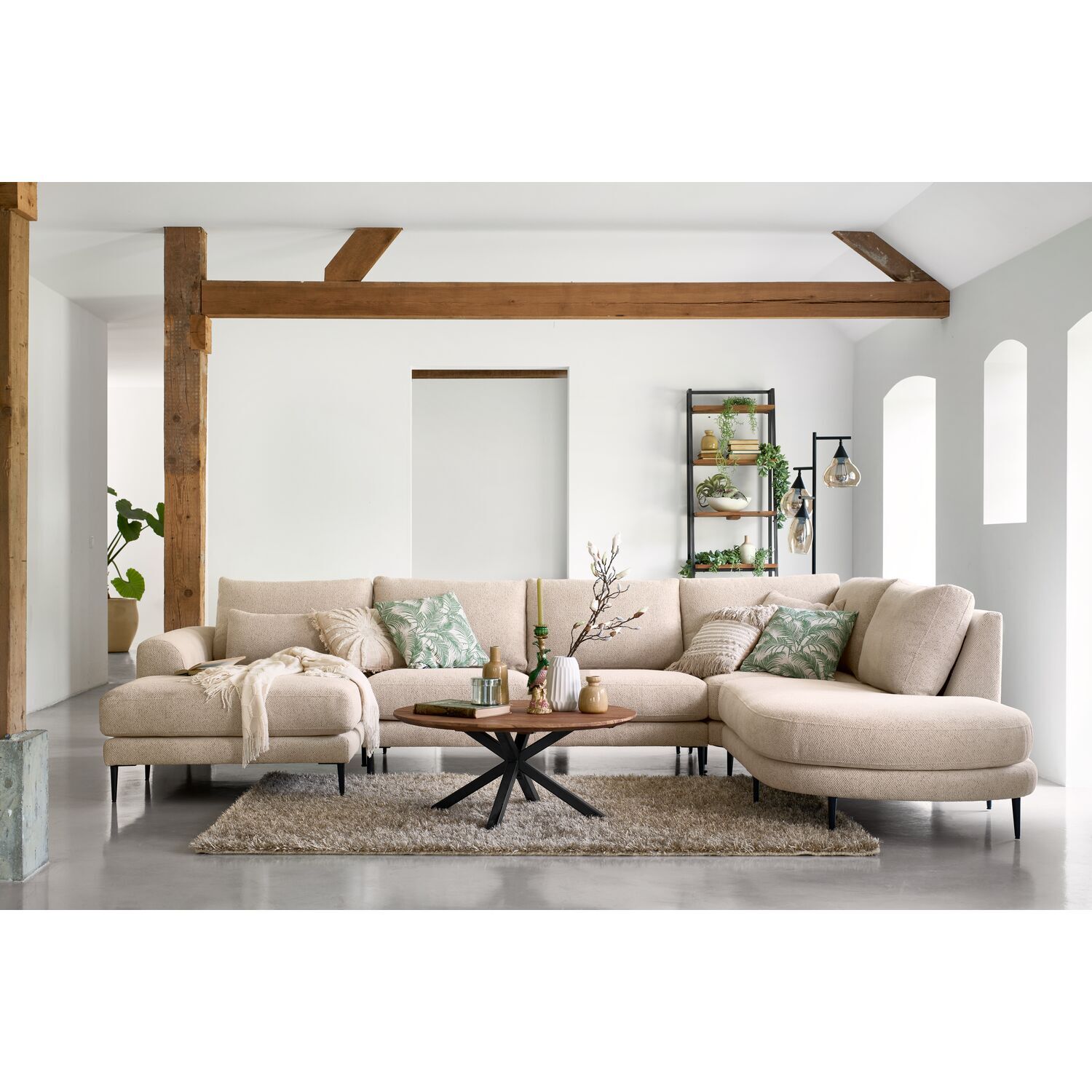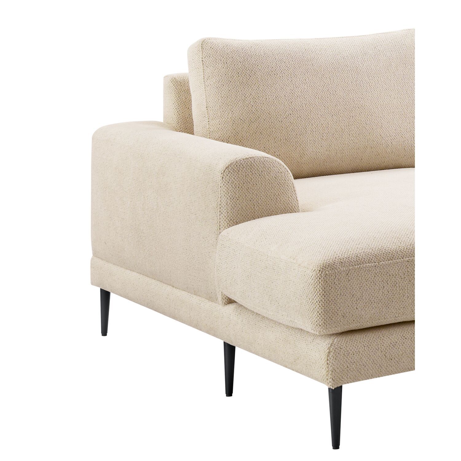 Longchair rond arm links + 2,5 zits zonder armen + hoekelement + 1 zits met eiland rond rechts uitgevoerd in stof macan 102-ecru met een toplaag van traagschuim in de zitting, HR-koudschuim met een afdeklaag van siliconenvlokken en donsveren in de rug en zwarte metalen poten, type M-14 (15 cm).
