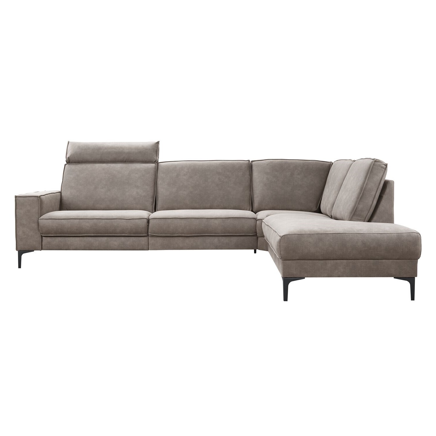 1,5 zits zonder arm met relaxfunctie en hoofdsteun + armleuning 1 links + 1,5 zits zonder arm + hoek met eiland rechts in stof python 83-cacao met pocketvering met een toplaag van HR-koudschuim in de zitting, HR-koudschuim in de rugkussens en zwarte metalen poten (1A6K).