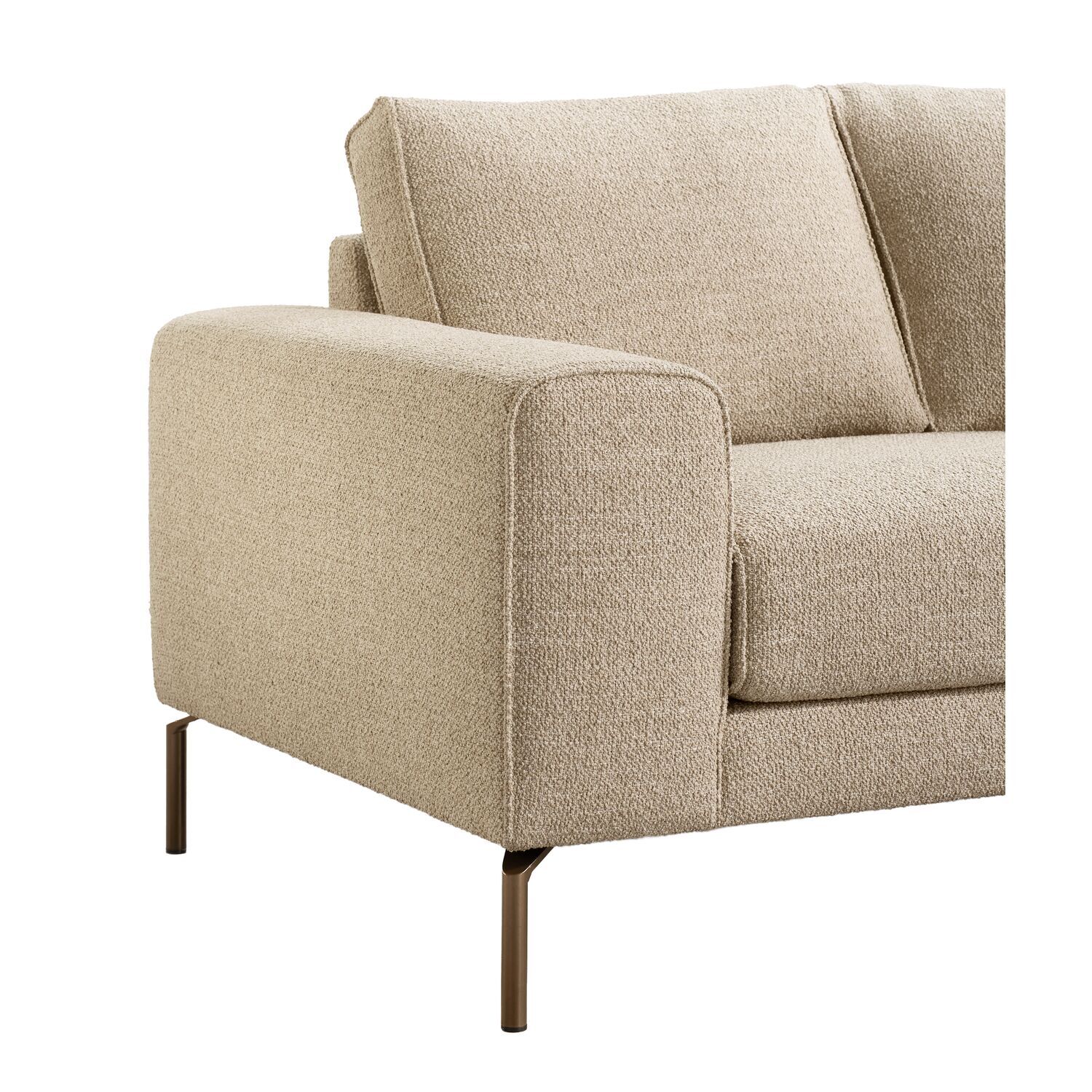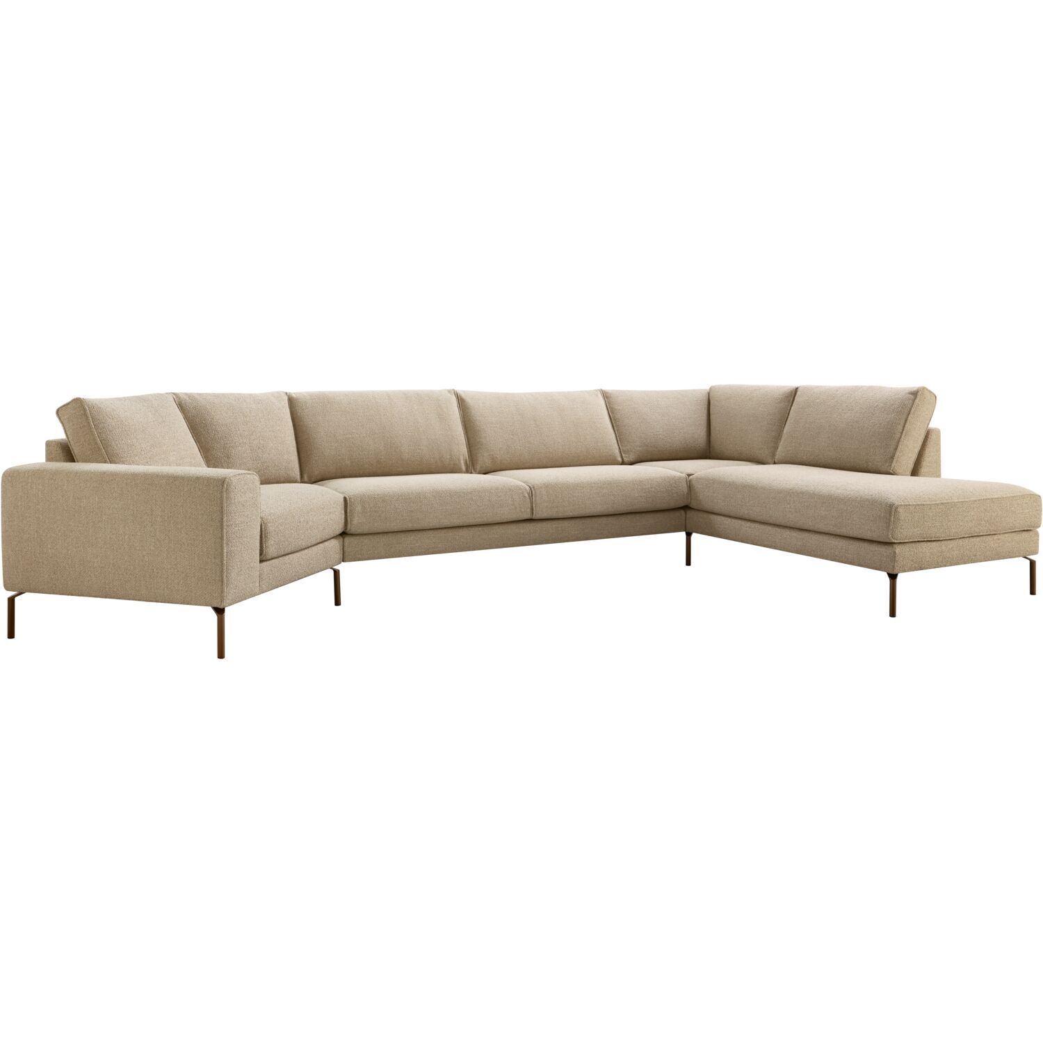 Hoekbank Linoza heeft een moderne, tijdloze uitstraling door de royale vormen en de losse zit- en rugkussens. De bank is uitgevoerd in een weefstof in een warme natureltint met een subtiele structuur, die zacht aanvoelt en zorgt voor een natuurlijke en sfeervolle uitstraling. De metalen poten in een warme bruintint geven de bank een stijlvol en eigentijds accent.