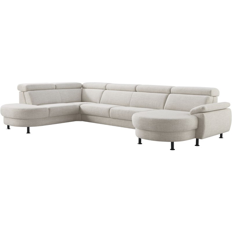 Hoek met eiland rond links + 2,5 zits zonder armen + longchair rond arm rechts uitgevoerd in stof oasis 214-herb met arm type F, diepe zit (56 cm), verstelbare hoofdsteunen, memory foam i.c.m. HR-schuim in de zitting en zwarte metalen poten type MF1 (12 c
