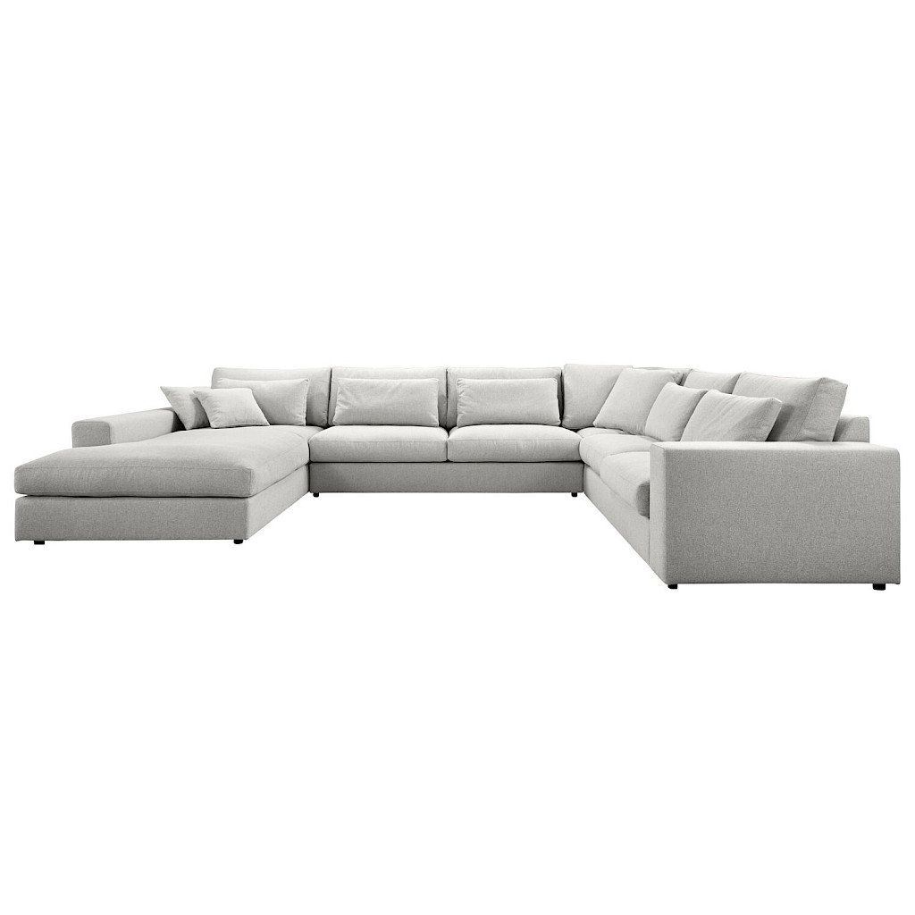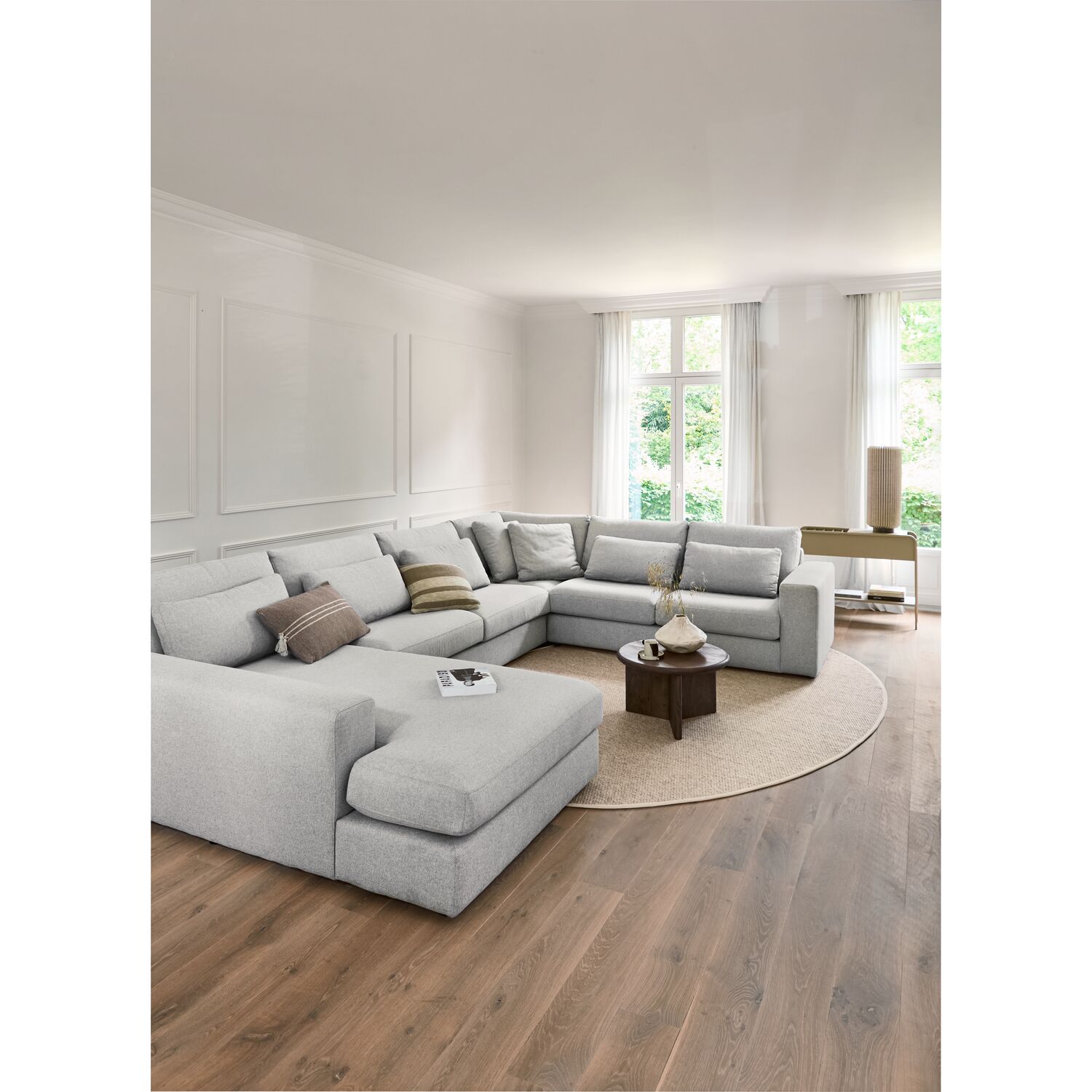 Longchair XL 95 arm links + 3 zits zonder arm + hoekelement + 2,5 zits arm rechts uitgevoerd in stof unit 60-light grey met zwarte kunststof poten, inclusief luxe 9-delige (lende)kussenset.