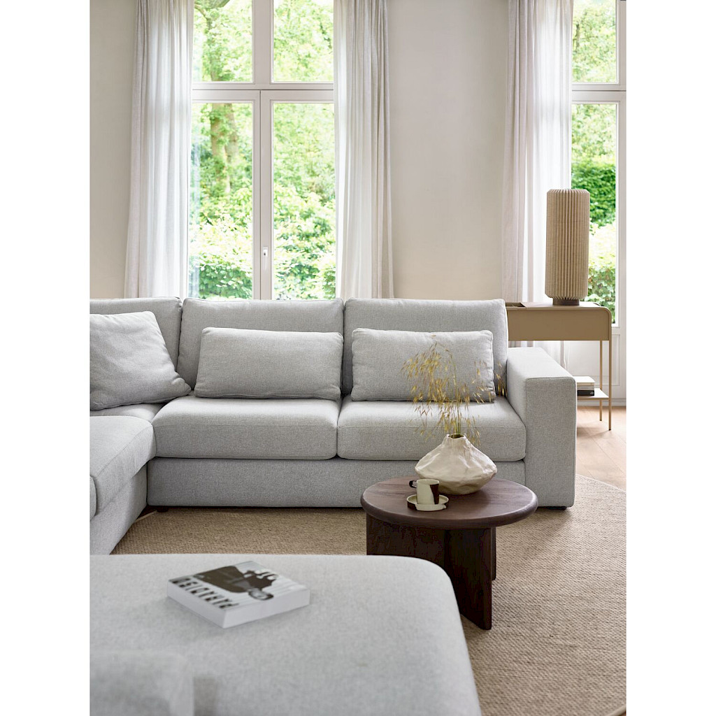 Model Rovella heeft een knusse uitstraling en is door de vormgeving in vele interieurstijlen te plaatsen. De hoekbank is uitgevoerd in een mooie grijze stof en zwarte metalen poten. De zwarte metalen pootjes staan wat meer naar binnen gepositioneerd zodat de bank een zweef effect krijgt.