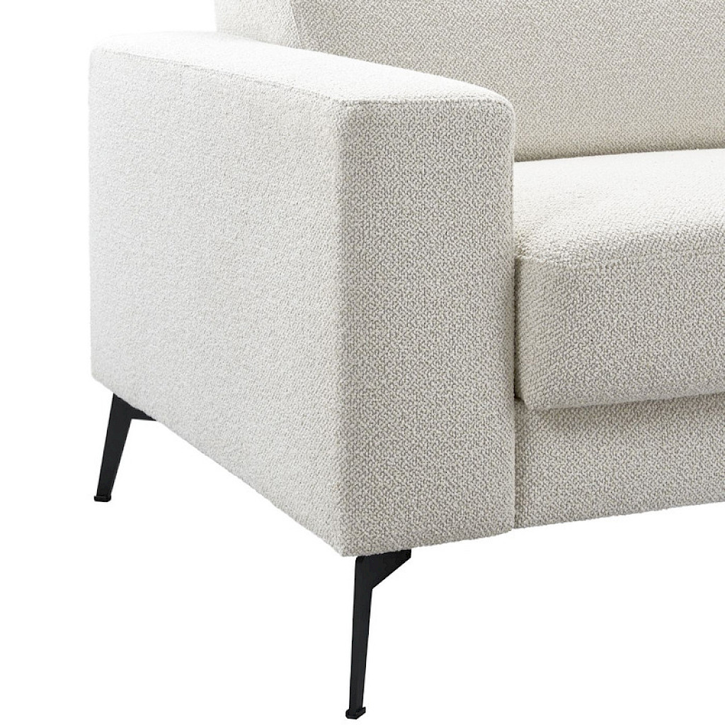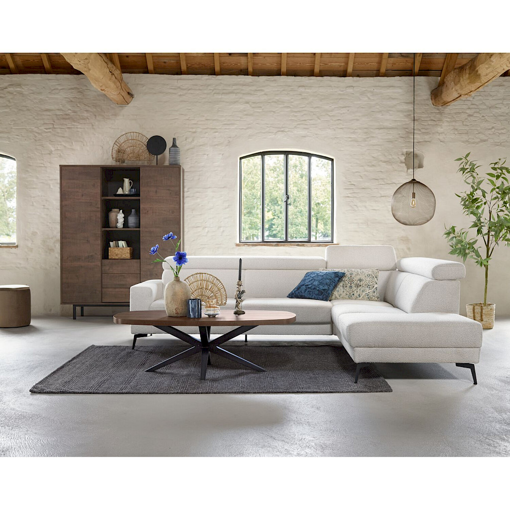 Deze ruime hoekbank met vaste zit- en rugkussens heeft de ideale combinatie van comfort en hedendaags design. De bank is gestoffeerd in de mooie stof Cosmo. Deze bouclé stof springt direct in het oog door de grove structuur en de matte uitstraling. De stof heeft een zachte touch en door het gebruik van verschillende beige en crèmekleurige draden krijg je een two-tone kleurenpalet wat een speciaal effect geeft aan de bank. De zwart metalen poten zijn niet alleen stevig en duurzaam, maar voegen ook een vleugje elegantie toe aan je interieur. Ze tillen de hele bank naar een hoger niveau, zowel qua stijl als functionaliteit.