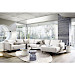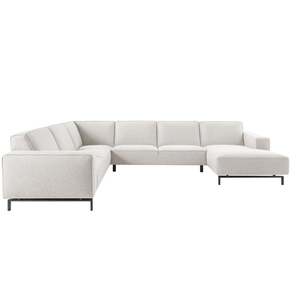 2,5 zits arm links + hoekelement + 2,5 zits zonder armen + longchair arm rechts uitgevoerd in stof florence 5515-white grey met arm A (recht), HR-schuim in de zitting (standaard zitcomfort) en zwarte metalen sledepoten.